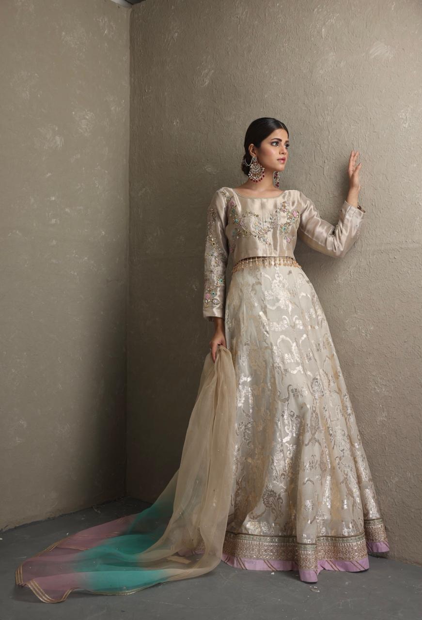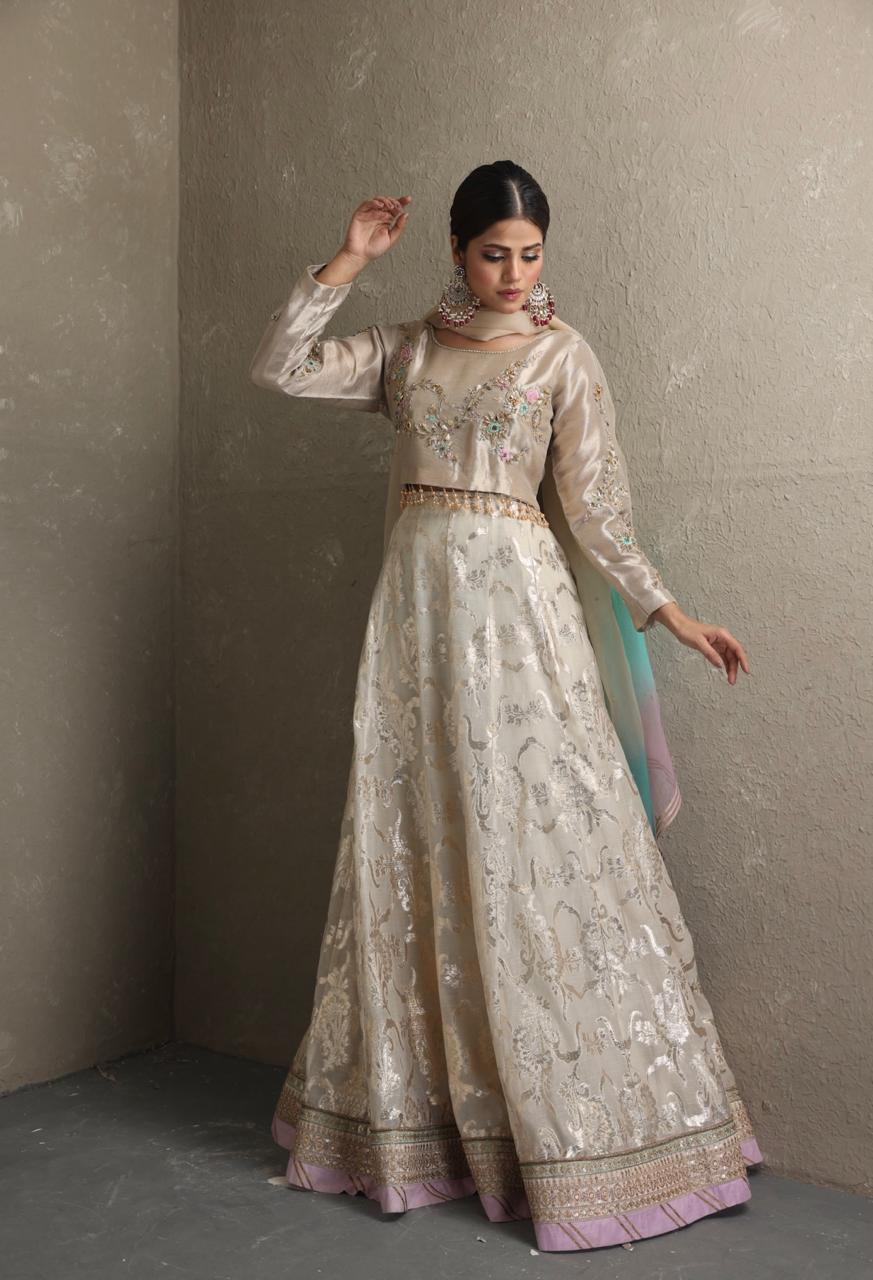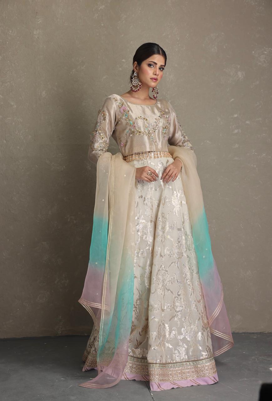 This heirloom piece is exquisitely hand embroidered with machine work by fine zardozi craftsmen. The voluminous laurex lehnga is paired with an intricately embroidered laces dupatta triple tone with zardozi chan and outlines with gotta and Lamey mild choli to give you a regal look and can be styled separately to create multiple unique looks.
