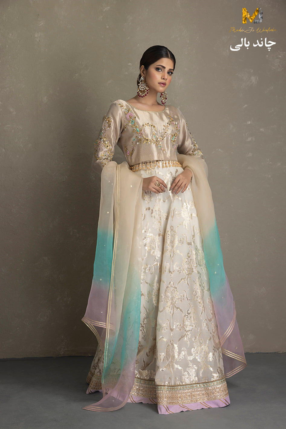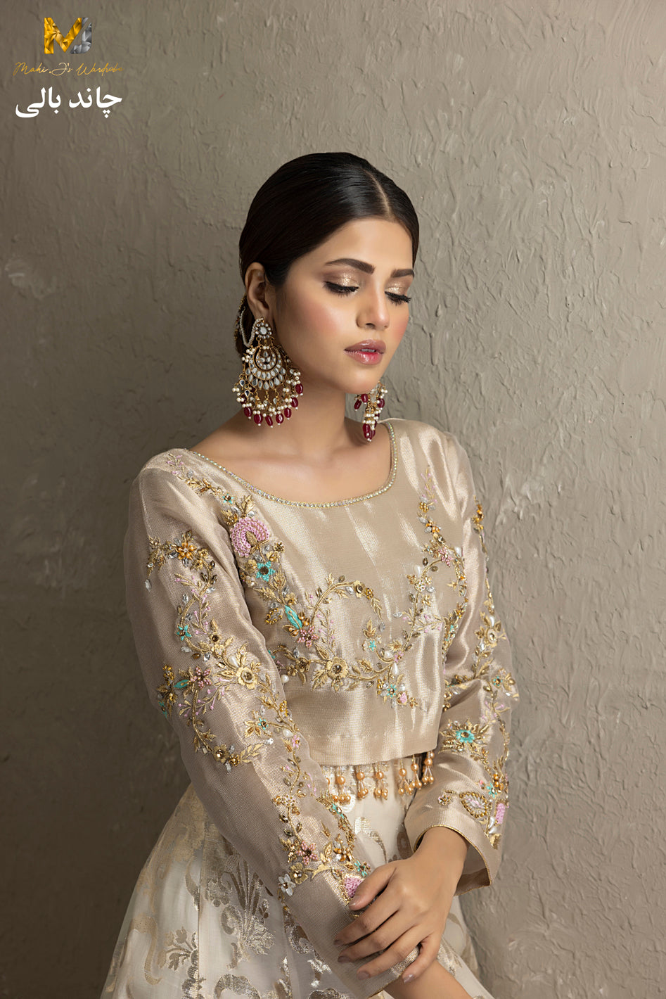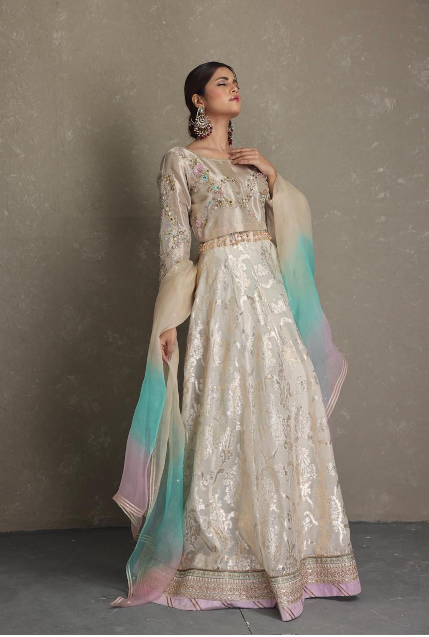 This heirloom piece is exquisitely hand embroidered with machine work by fine zardozi craftsmen. The voluminous laurex lehnga is paired with an intricately embroidered laces dupatta triple tone with zardozi chan and outlines with gotta and Lamey mild choli to give you a regal look and can be styled separately to create multiple unique looks.