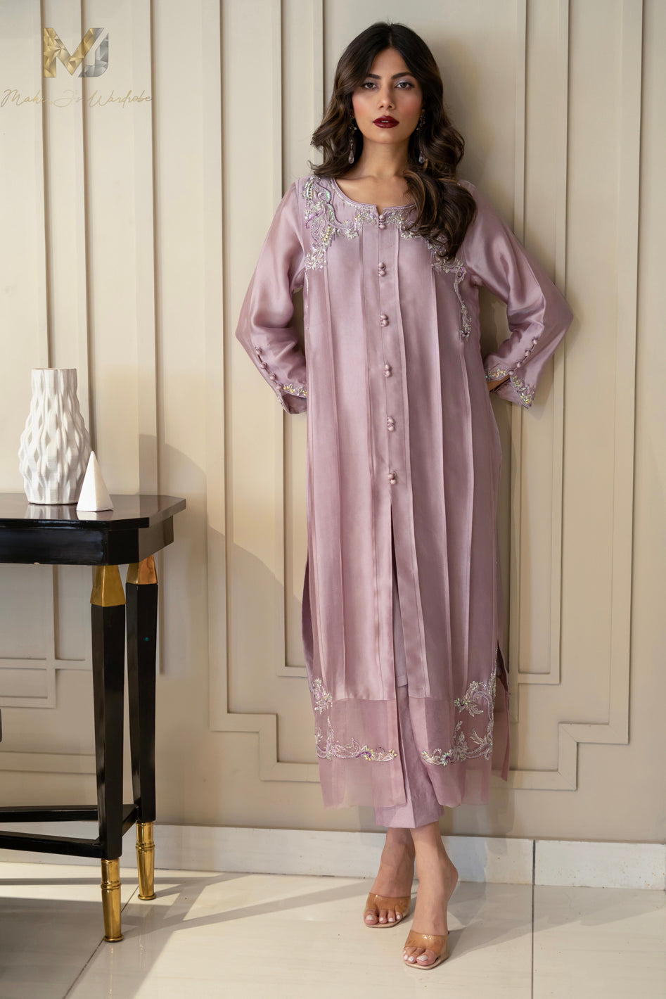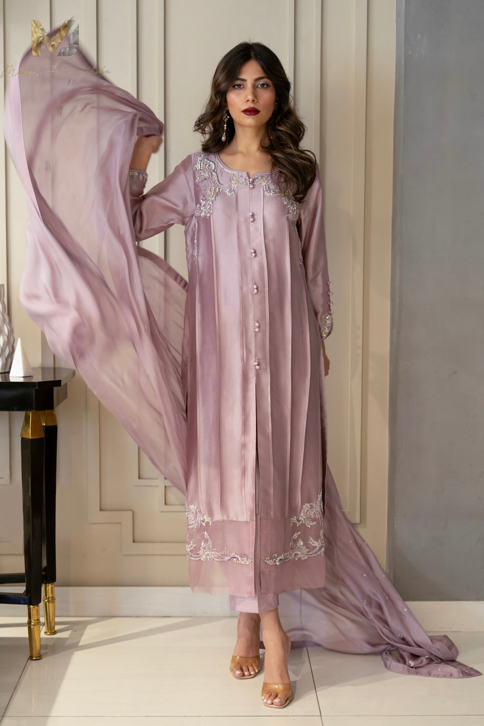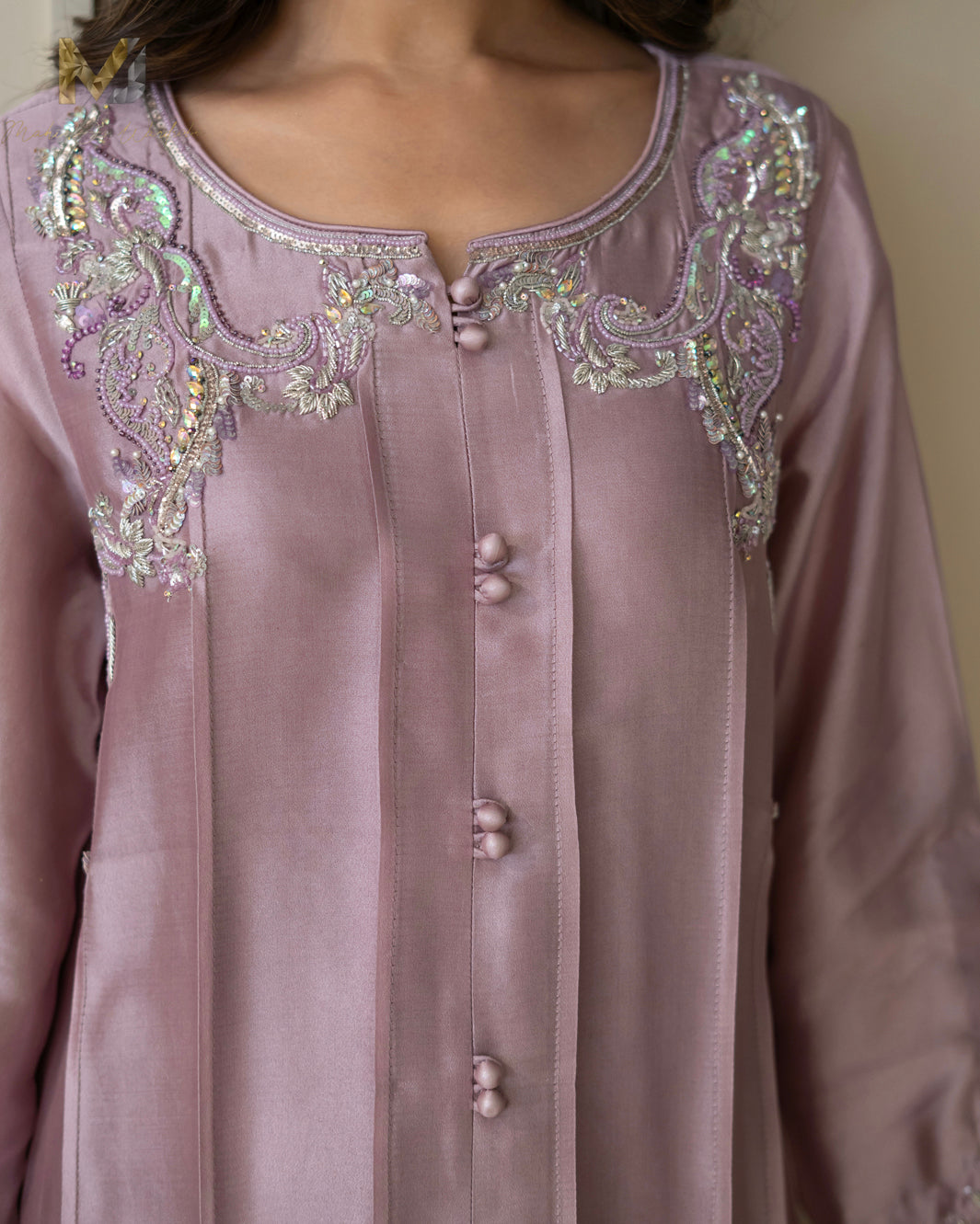 This onion lilac classic all over pleaded style front open shirt with loop button for premium look & feel exudes elegance, featuring exquisite gara embroidery on the sleeves , shoulder &daman . The shirt is paired with straight silk pants and comes with a medium silk dupatta, creating a regal and sophisticated ensemble.
