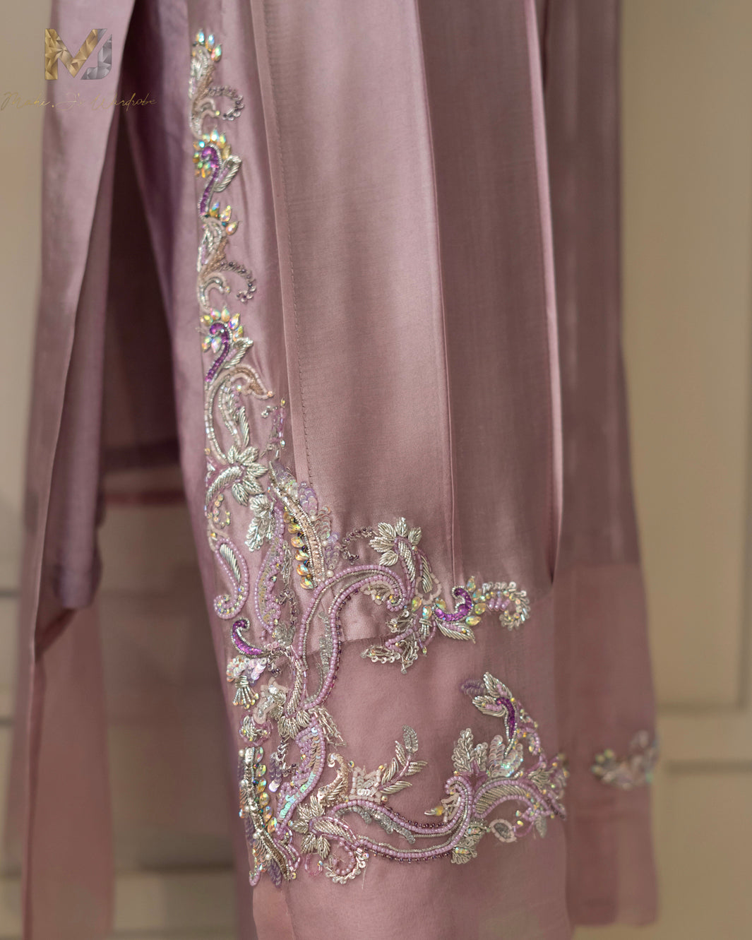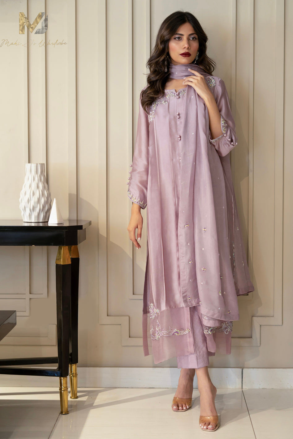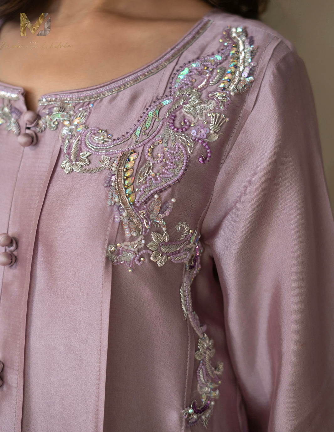 This onion lilac classic all over pleaded style front open shirt with loop button for premium look & feel exudes elegance, featuring exquisite gara embroidery on the sleeves , shoulder &daman . The shirt is paired with straight silk pants and comes with a medium silk dupatta, creating a regal and sophisticated ensemble.