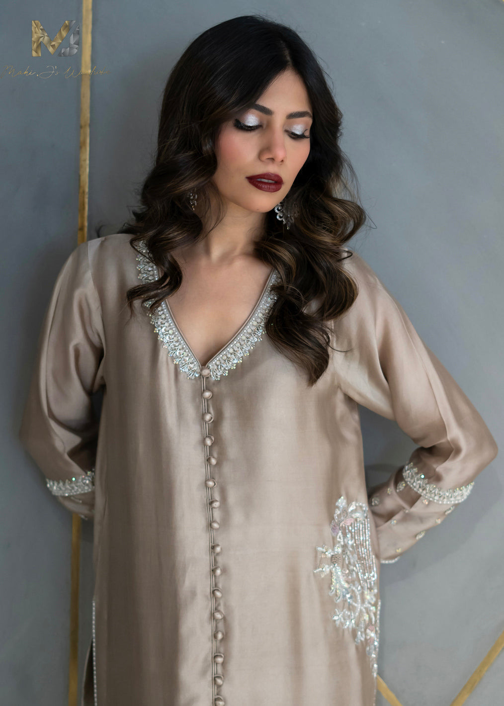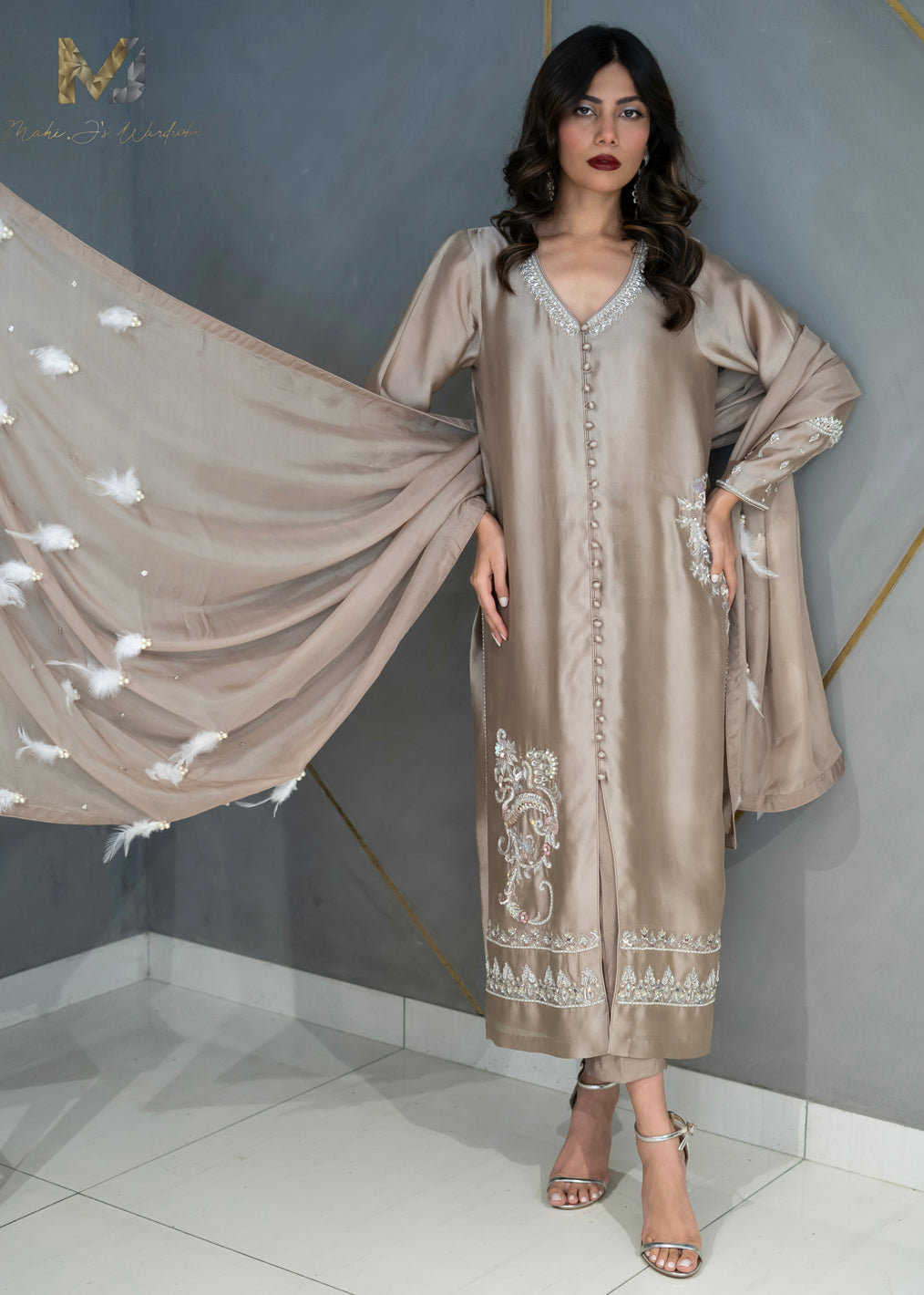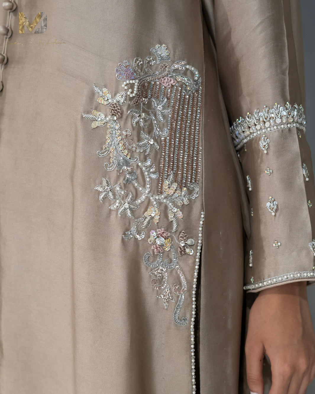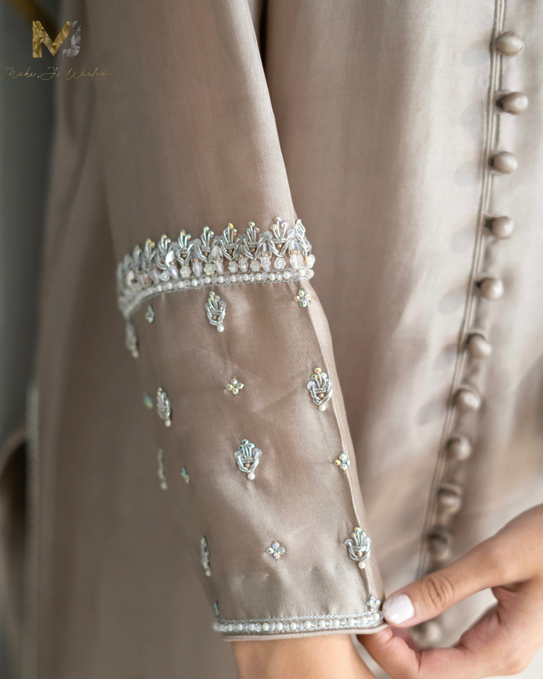 Make a lasting impression in “Ember” our hand embroidered silk shirt with graceful hand work sleeves. Paired with a luxurious cotton silk trouser detailed with intricate design , this ensemble exudes elegance. The silk textures and materials accents on the shirt front patti, sleeves, and daaman add a touch of sophistication. Complete your look with our pure stable pants, featuring straight and intricate cut finishing, and an organza dupatta for a flawless finish.