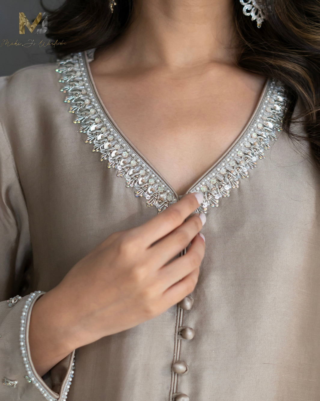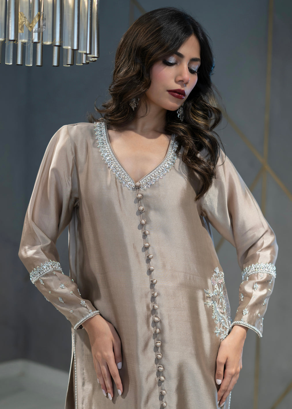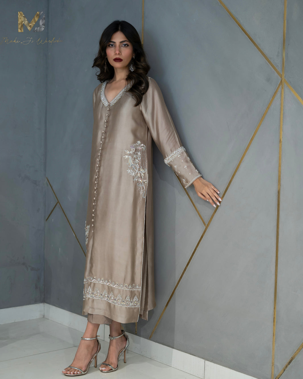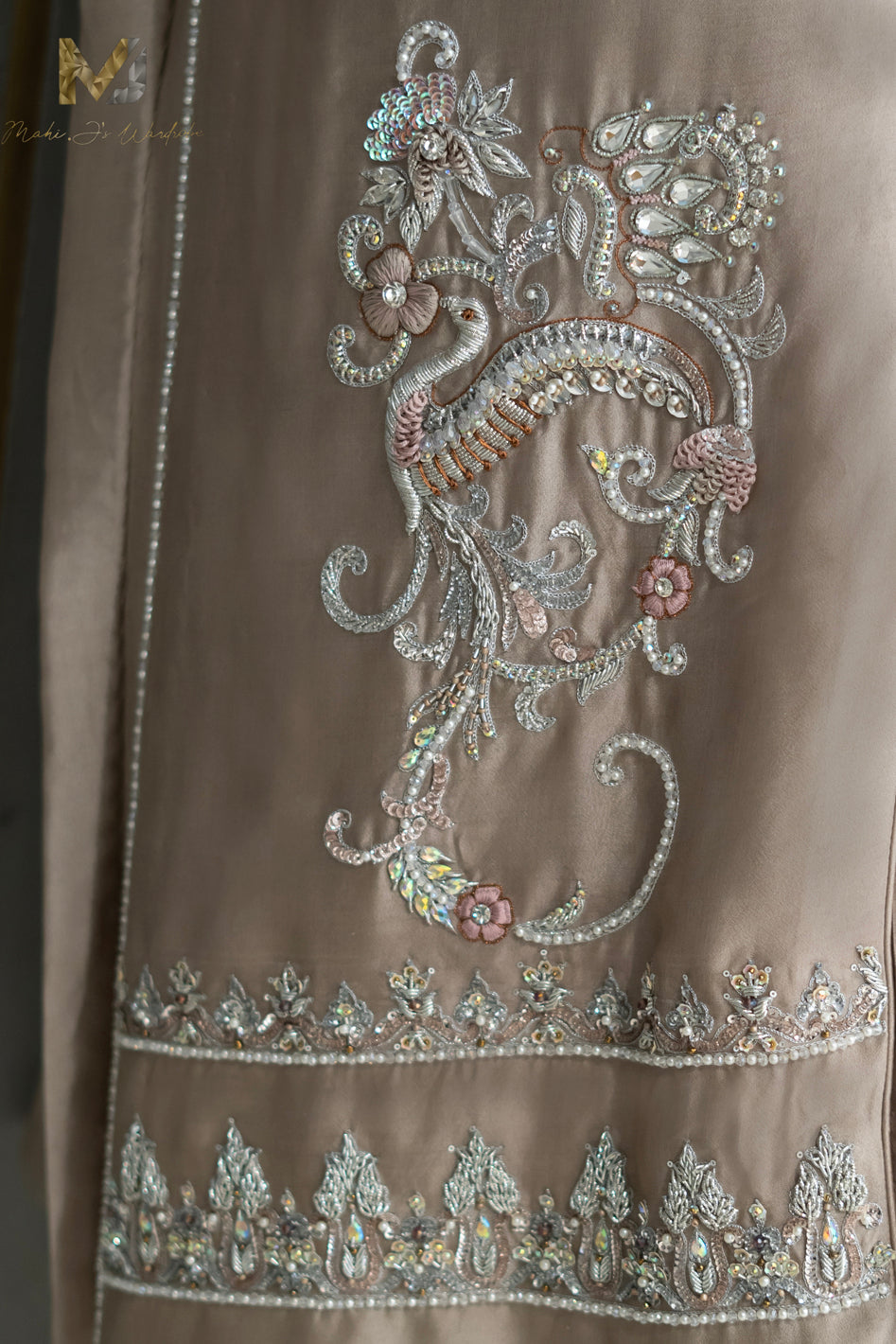 Make a lasting impression in “Ember” our hand embroidered silk shirt with graceful hand work sleeves. Paired with a luxurious cotton silk trouser detailed with intricate design , this ensemble exudes elegance. The silk textures and materials accents on the shirt front patti, sleeves, and daaman add a touch of sophistication. Complete your look with our pure stable pants, featuring straight and intricate cut finishing, and an organza dupatta for a flawless finish.
