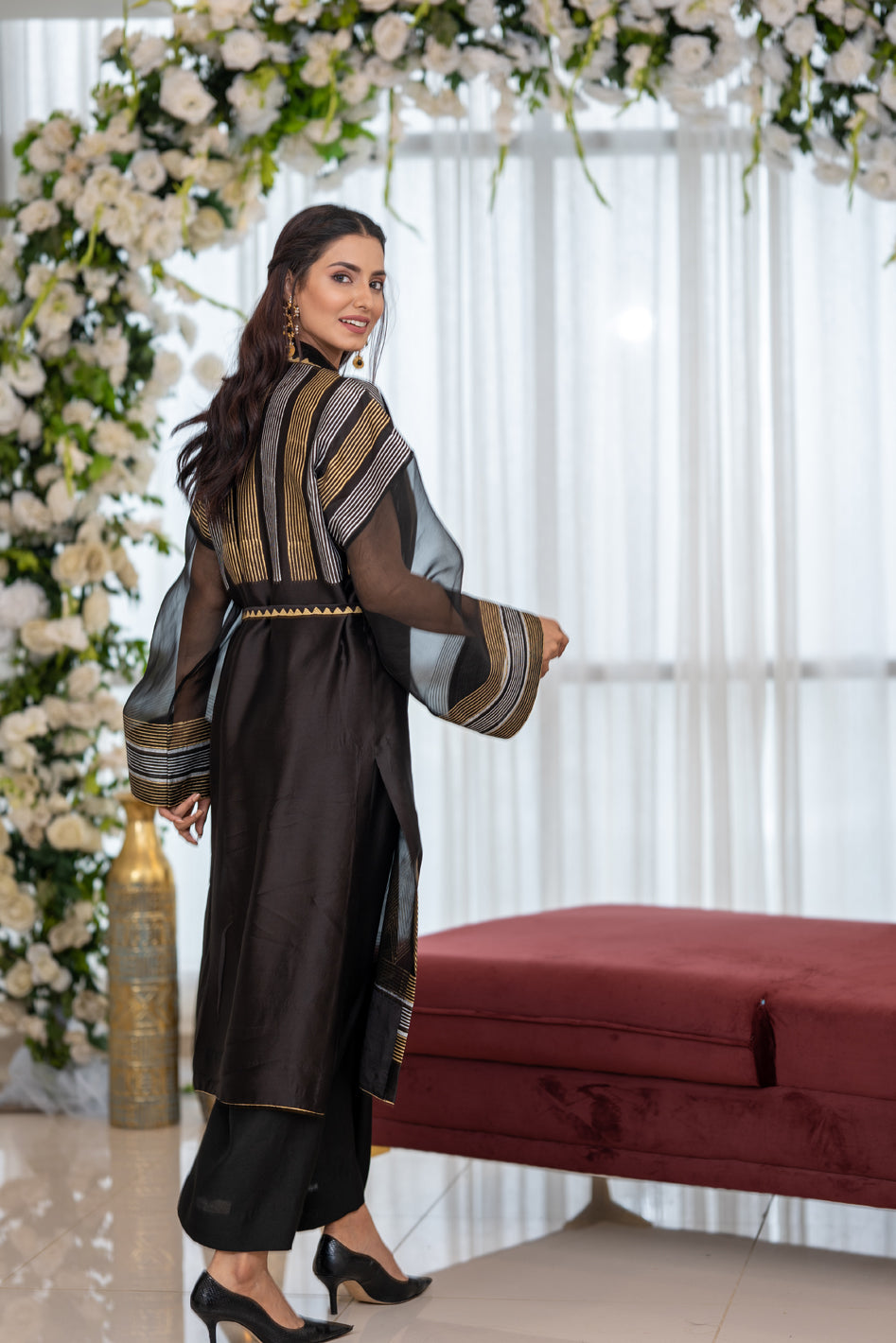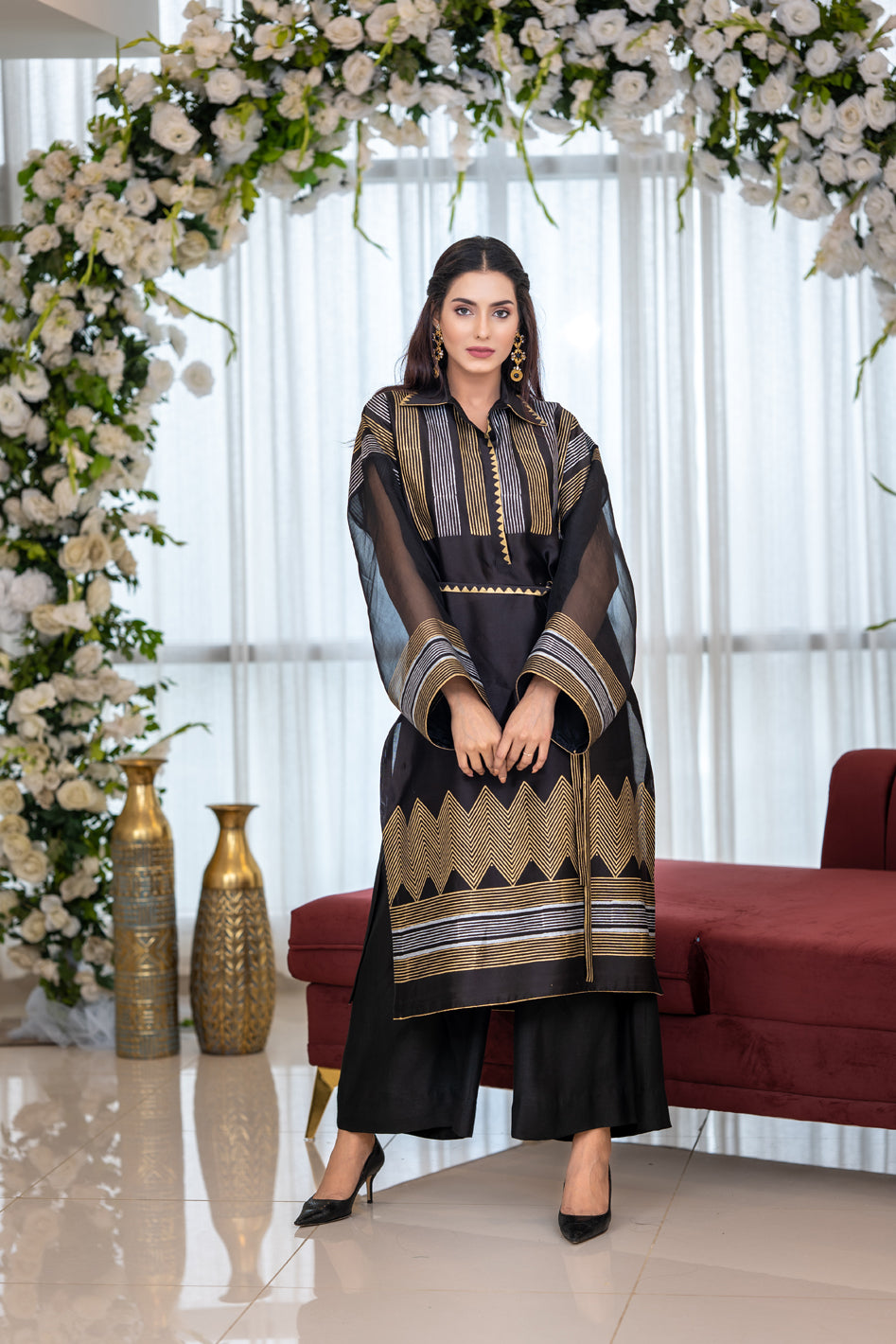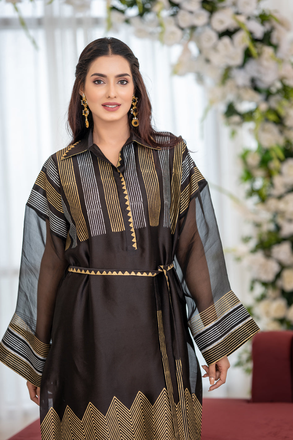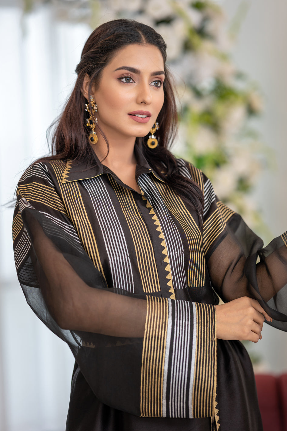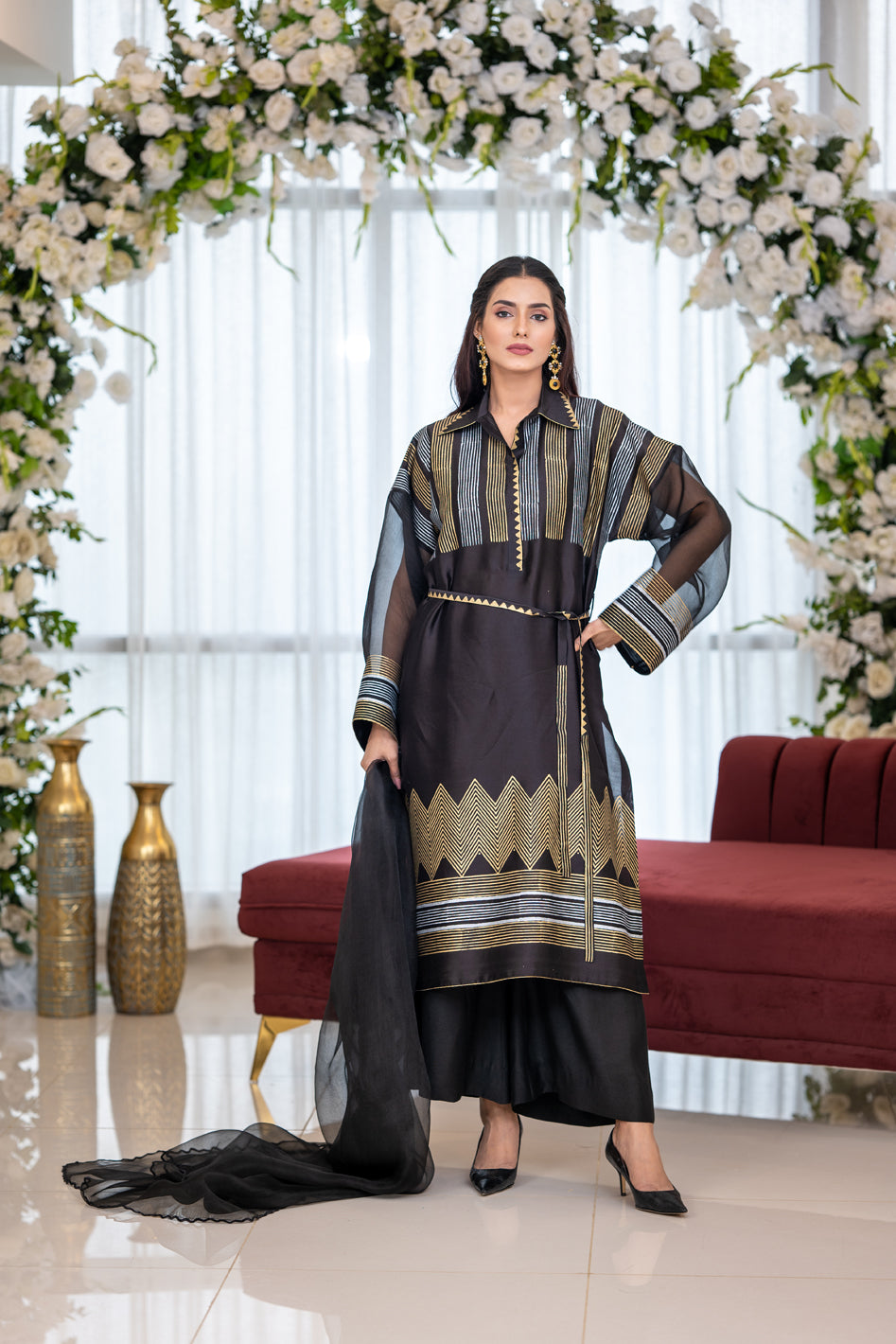 Elevate your style with 'JANA' from MAHI.J’s festive collection .' The black block-printed gold & silver shirt, adorned with waist belt , paired with silk pants and a matching dupatta, exudes chic sophistication for your #Stitched