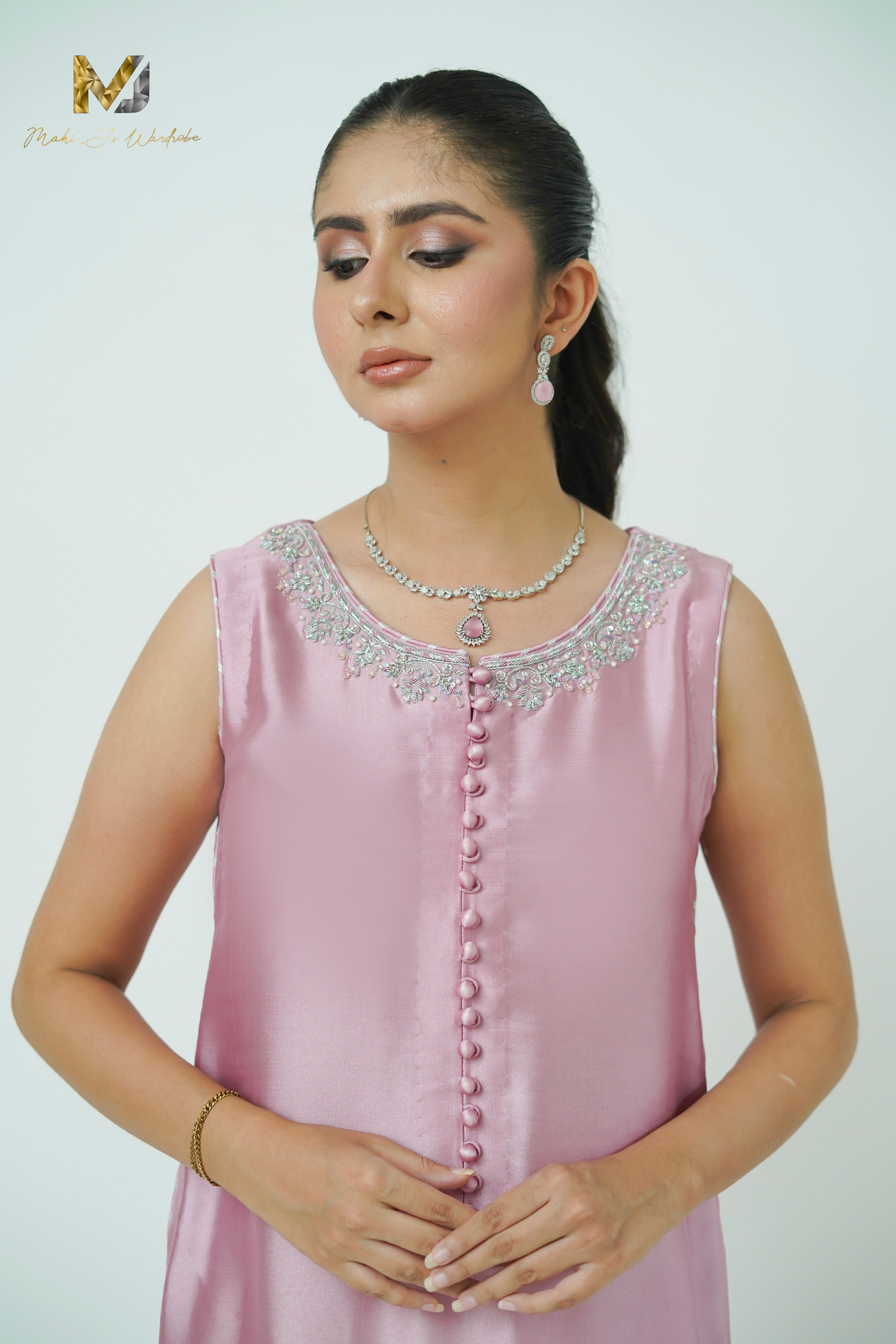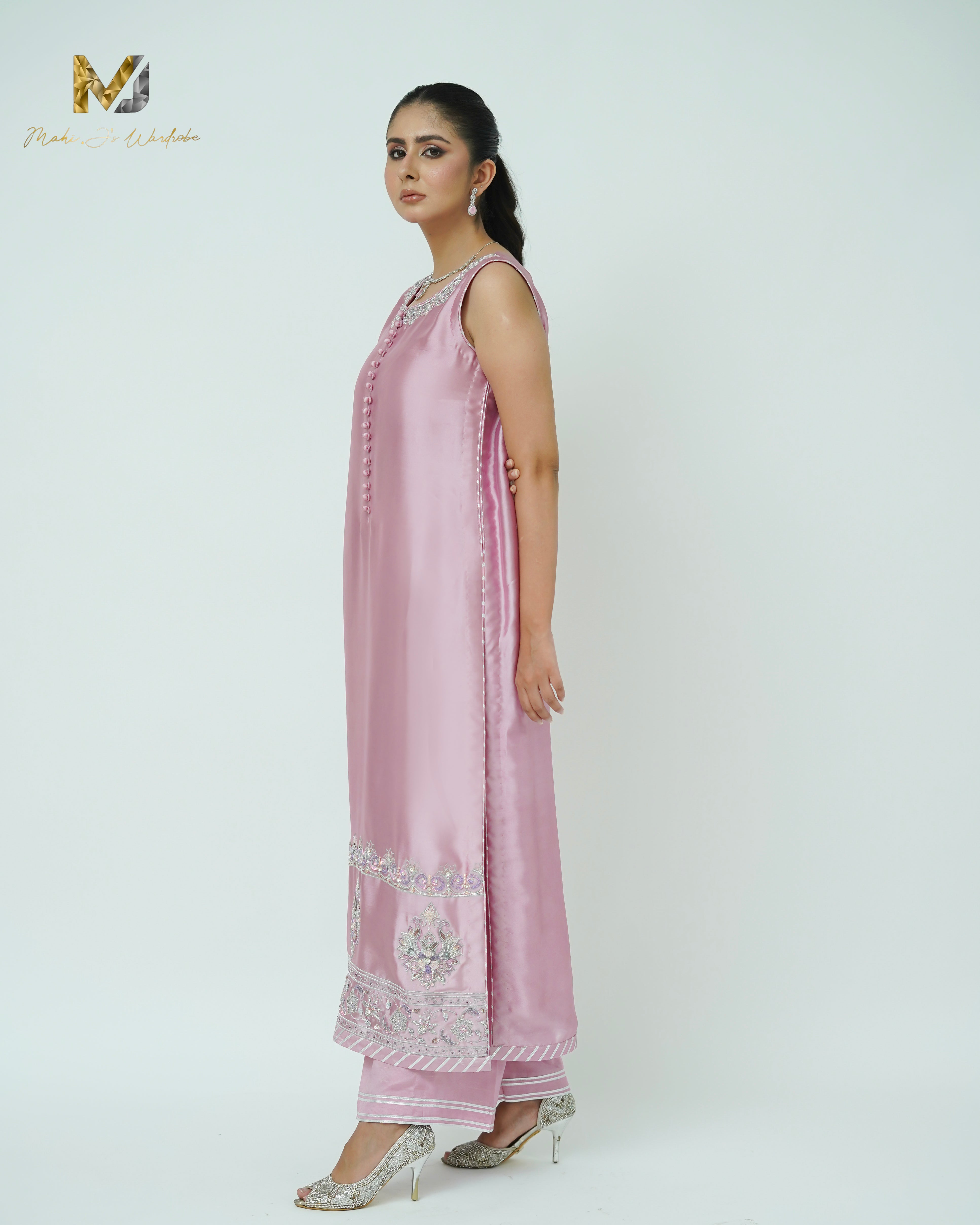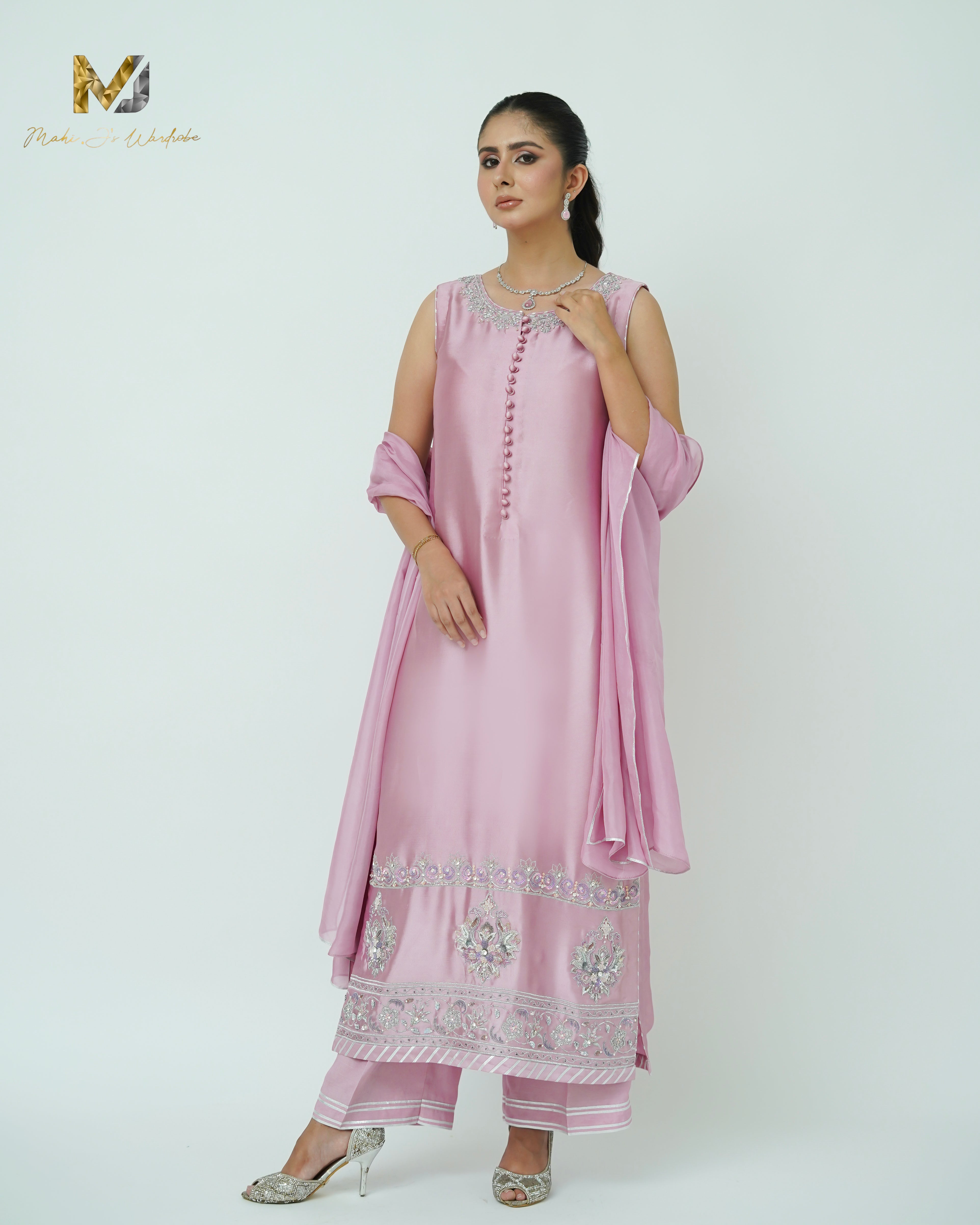 This captivating MOON PINK sheesha silk shirt and CULOTTES WITH GOTA set features a unique hem and striking neckline, offering a blend of modern design and traditional elegance. The shirt is intricately adorned with Swarovski crystals, adding a touch of sparkle and luxury to the fabric. Hand-embellished motifs grace the hem, neckline and sleeves, creating a delicate, feminine touch that enhances the overall charm of the piece. Paired with this stunning shirt is a soft SILK dupatta, finished with GOTA on edges, tying the look together with grace and sophistication. This ensemble is perfect for someone looking to make a statement with a perfect balance of glamour and refinement. Dupatta is an add on.