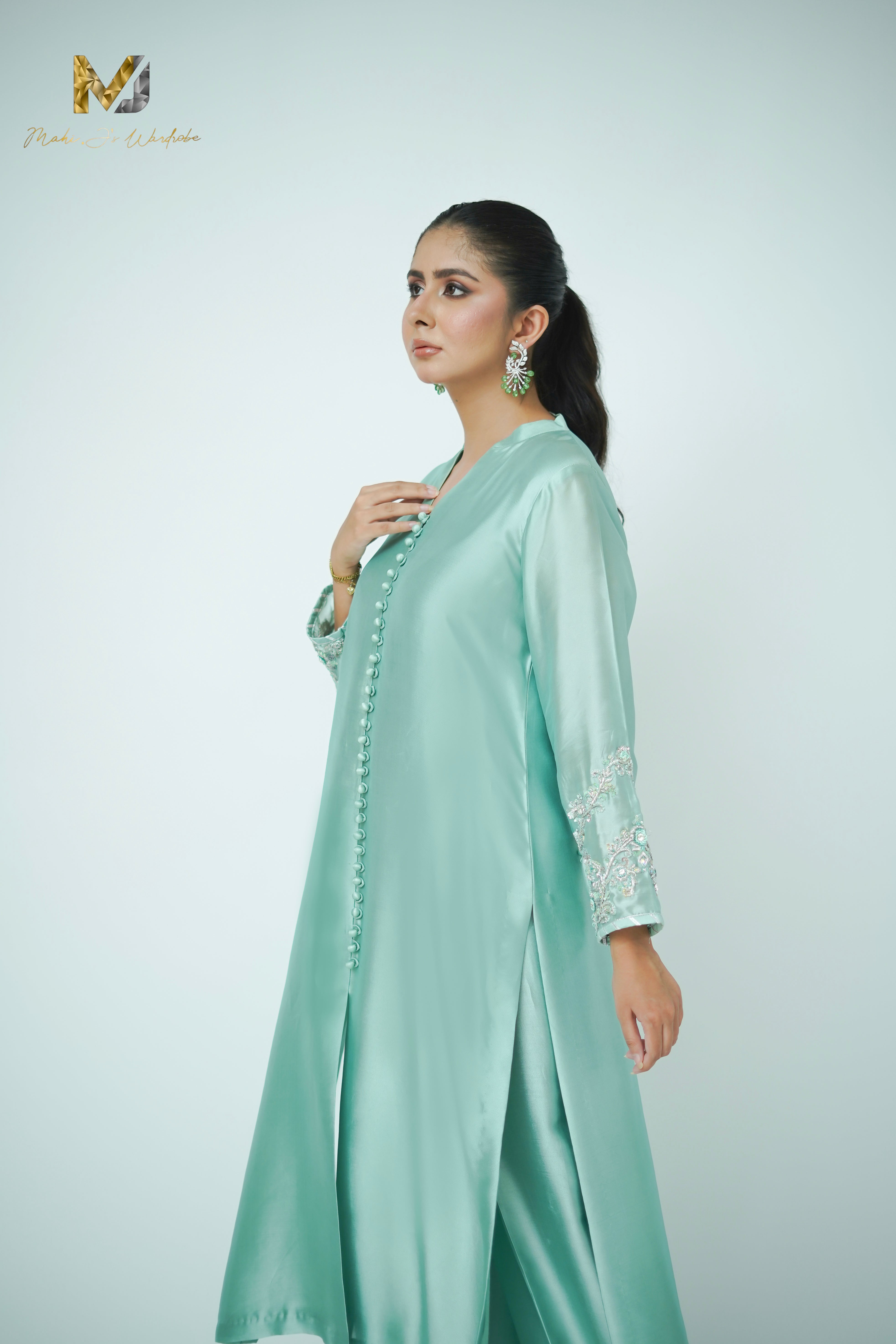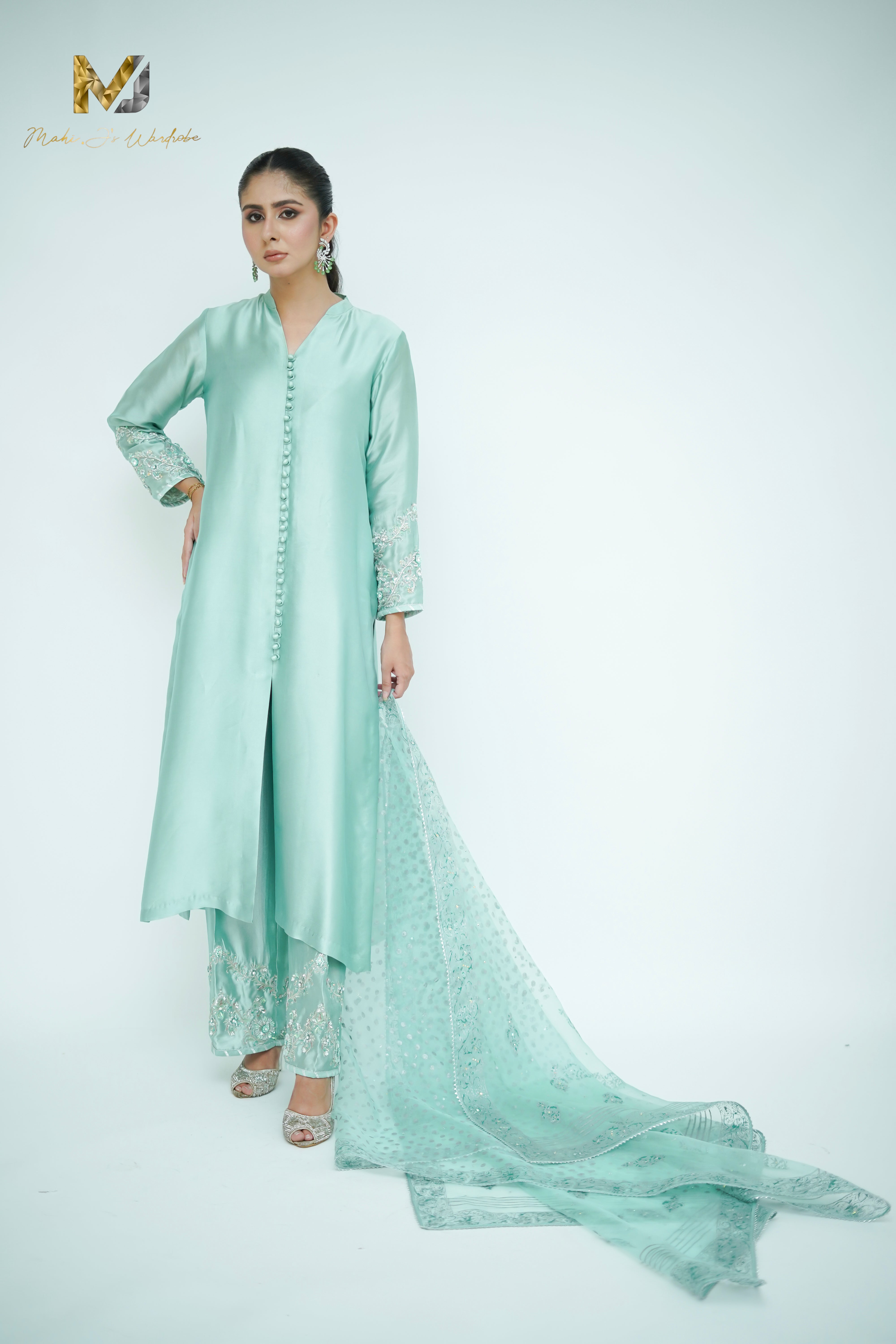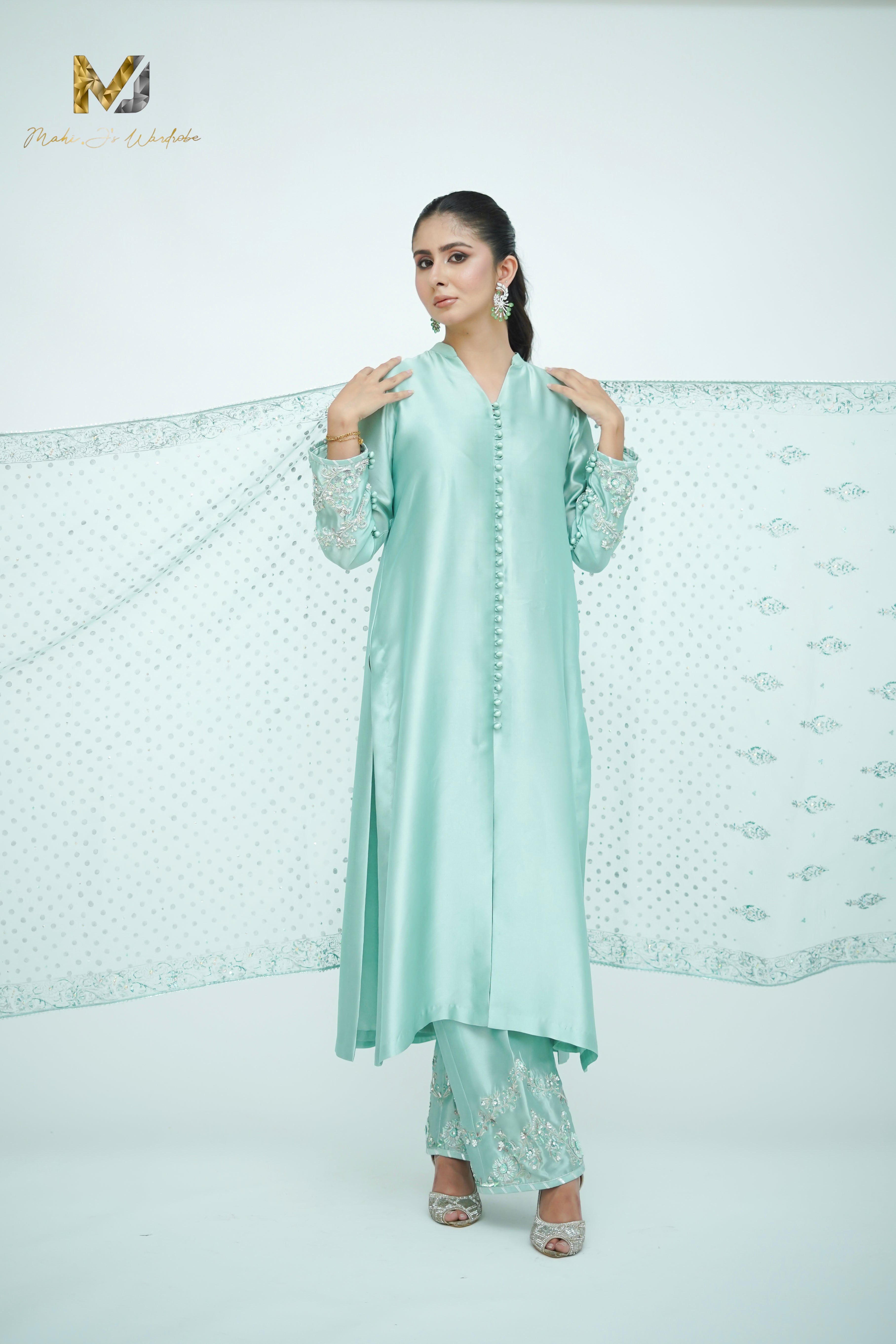 In a hushed shade of sage, this ensemble finds strength in restraint. The silk front open shirt with heavily zardozi sleeves work with loop bottons ,izaar glimmer subtly with hand-worked zardozi in silver, offers a quiet conversation between light and texture. A soft organza block print dupatta , lightly work on edged with completes the look with poised elegance.