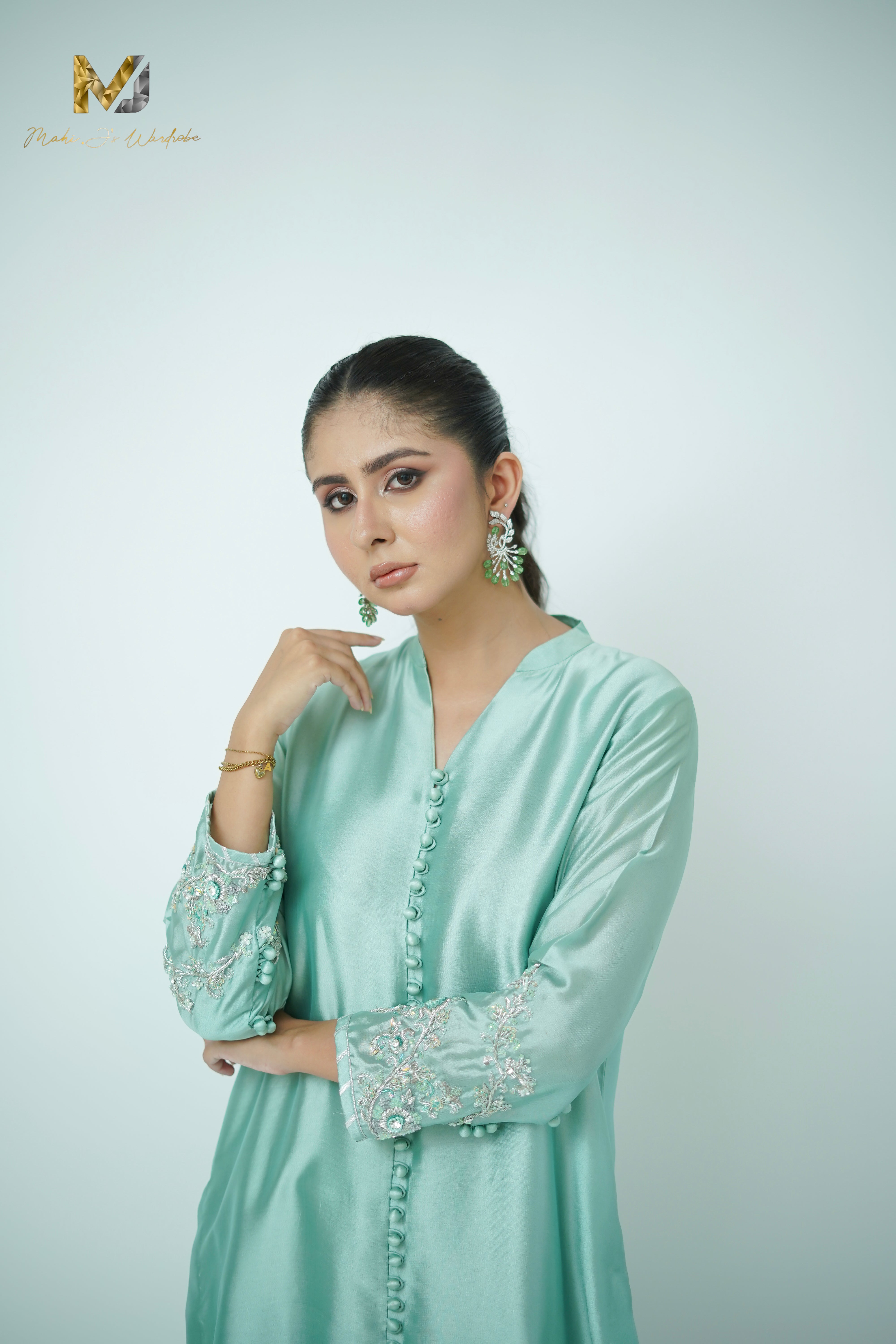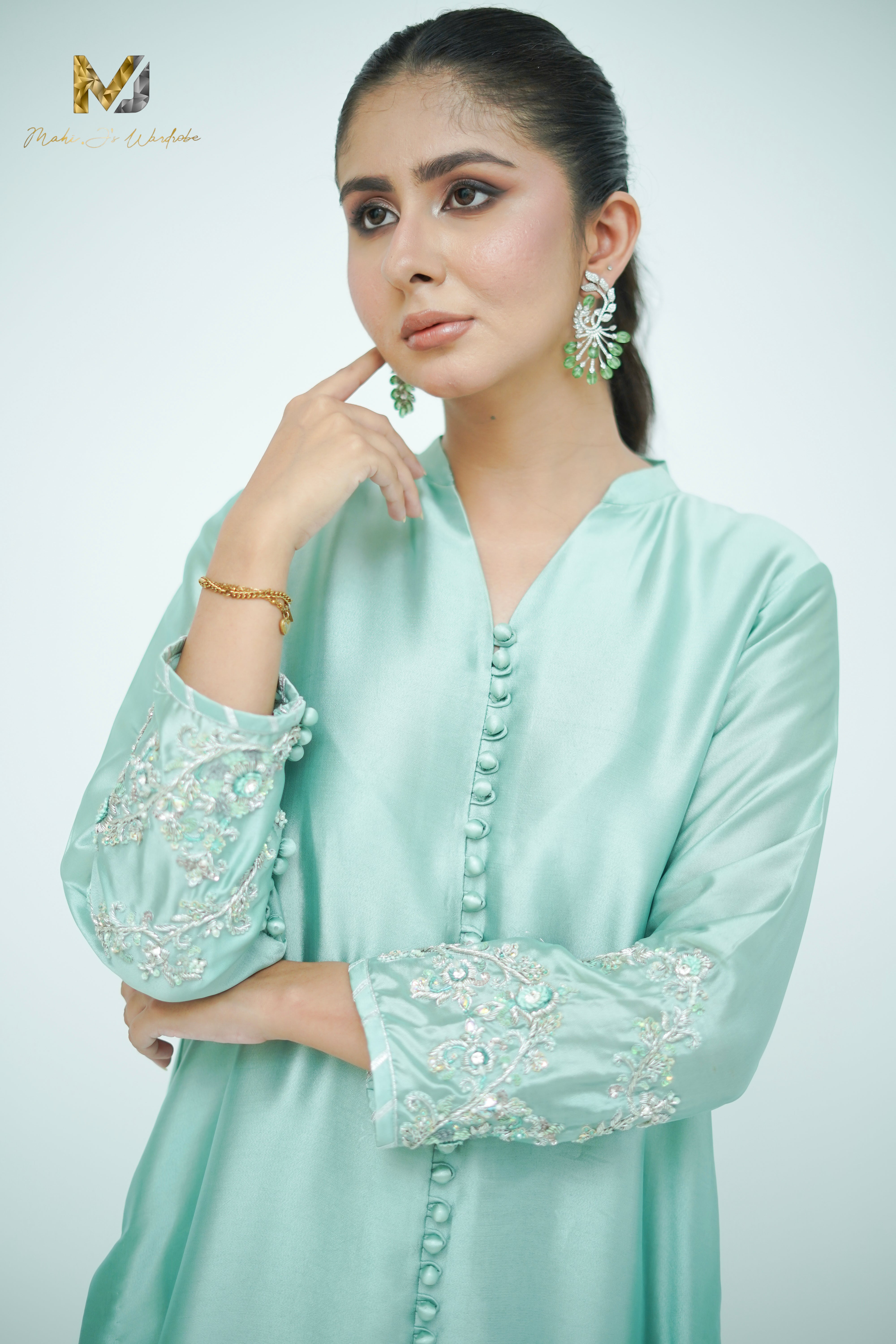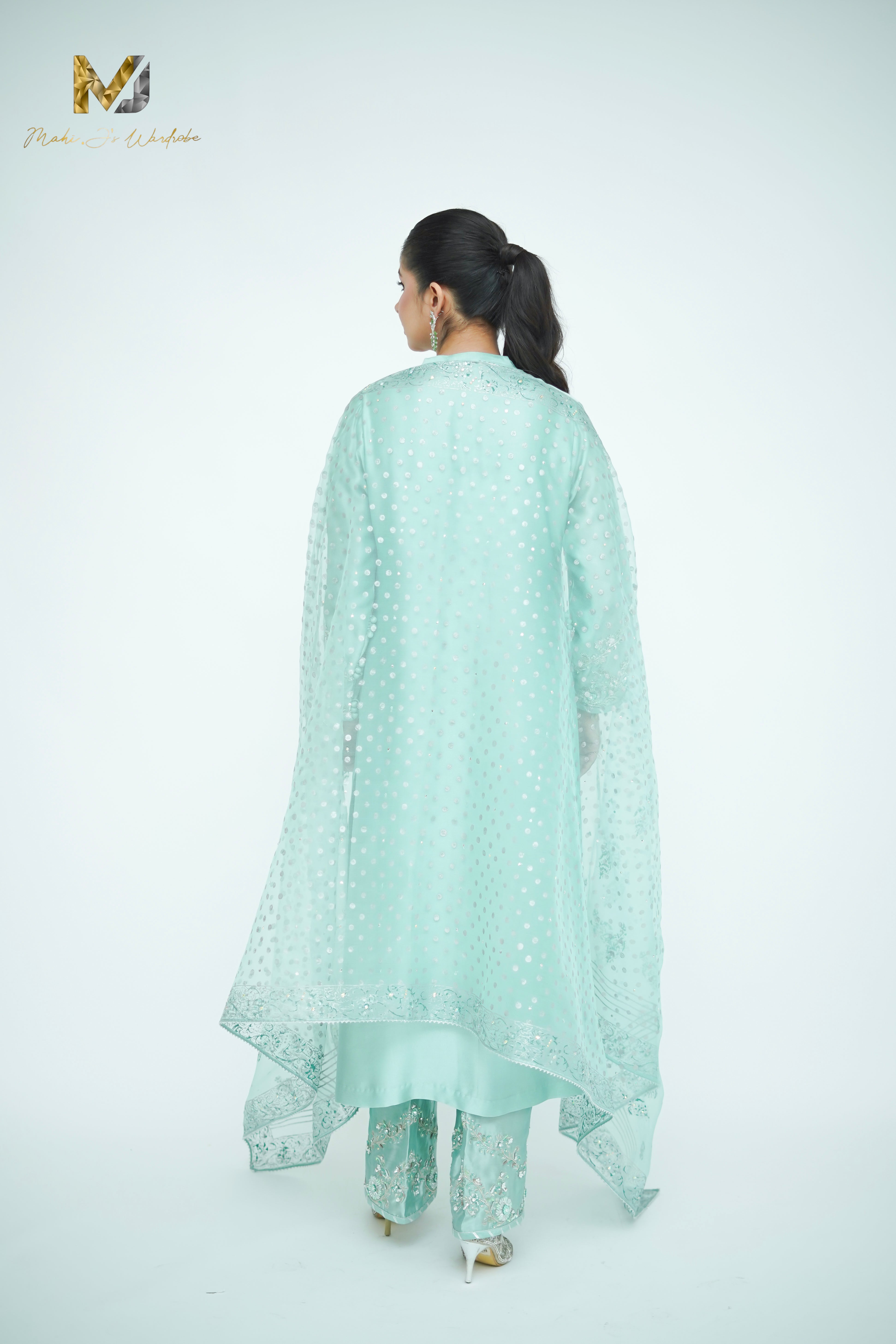 In a hushed shade of sage, this ensemble finds strength in restraint. The silk front open shirt with heavily zardozi sleeves work with loop bottons ,izaar glimmer subtly with hand-worked zardozi in silver, offers a quiet conversation between light and texture. A soft organza block print dupatta , lightly work on edged with completes the look with poised elegance.