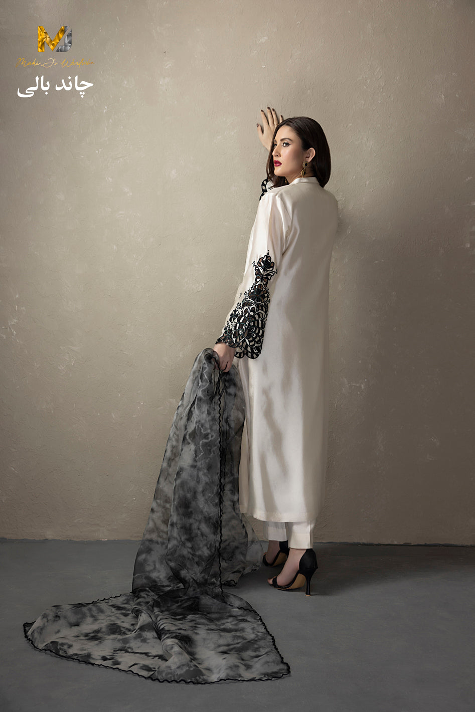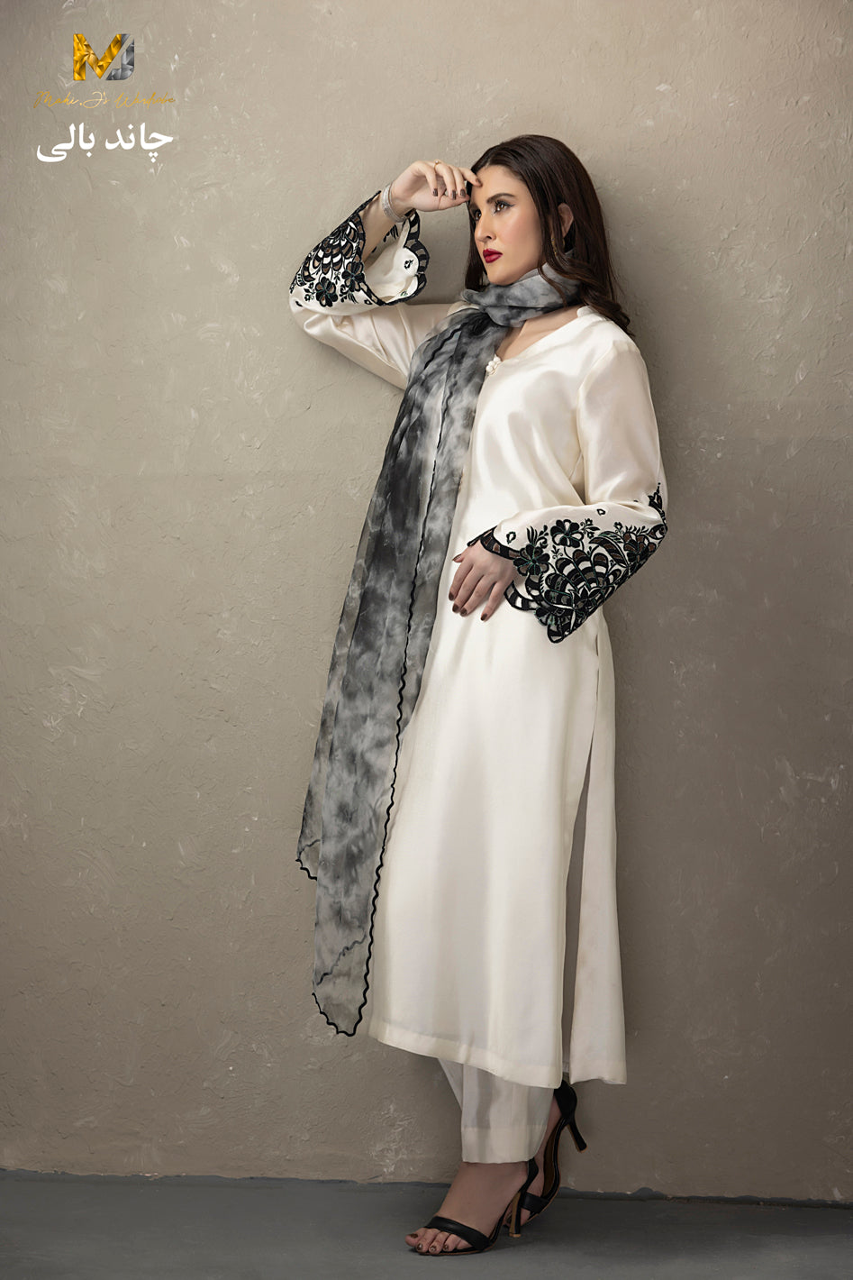 An off white sheesha silk shirt is a true stellar showcasing the art of appliques and cutwork. A straight pants compliments the stylish A lined daman kurta, giving it that volume. Organza dupatta with pleats and appliqués makes everything come together for the perfect Eid luxe look.