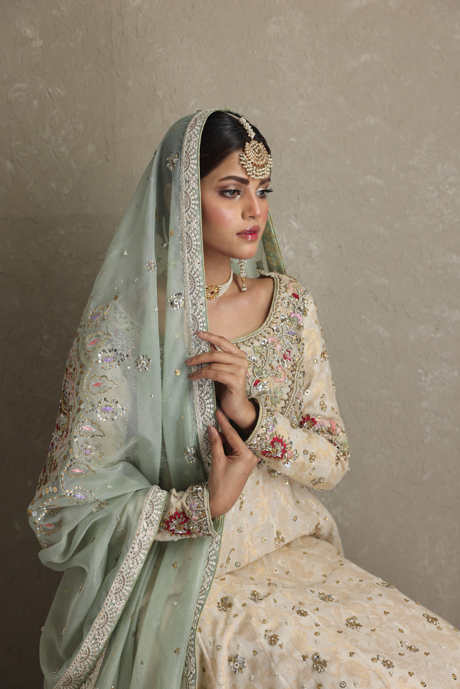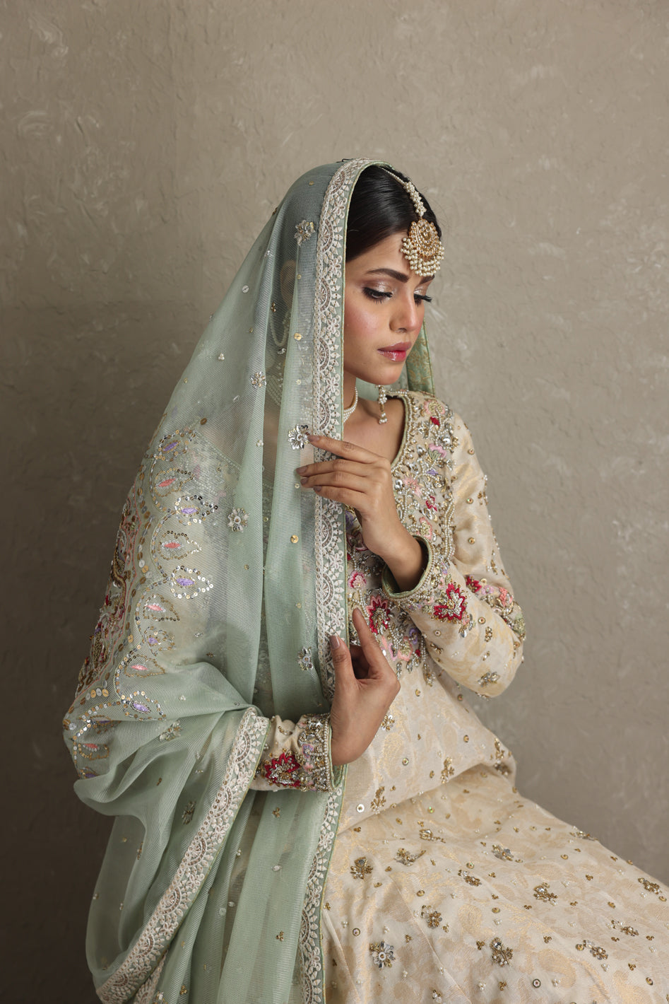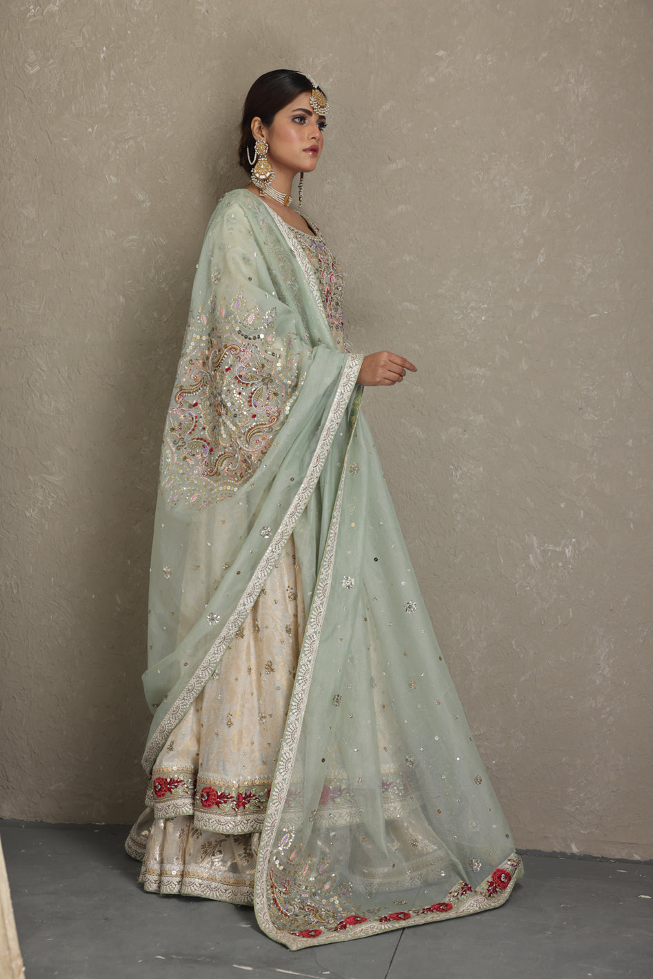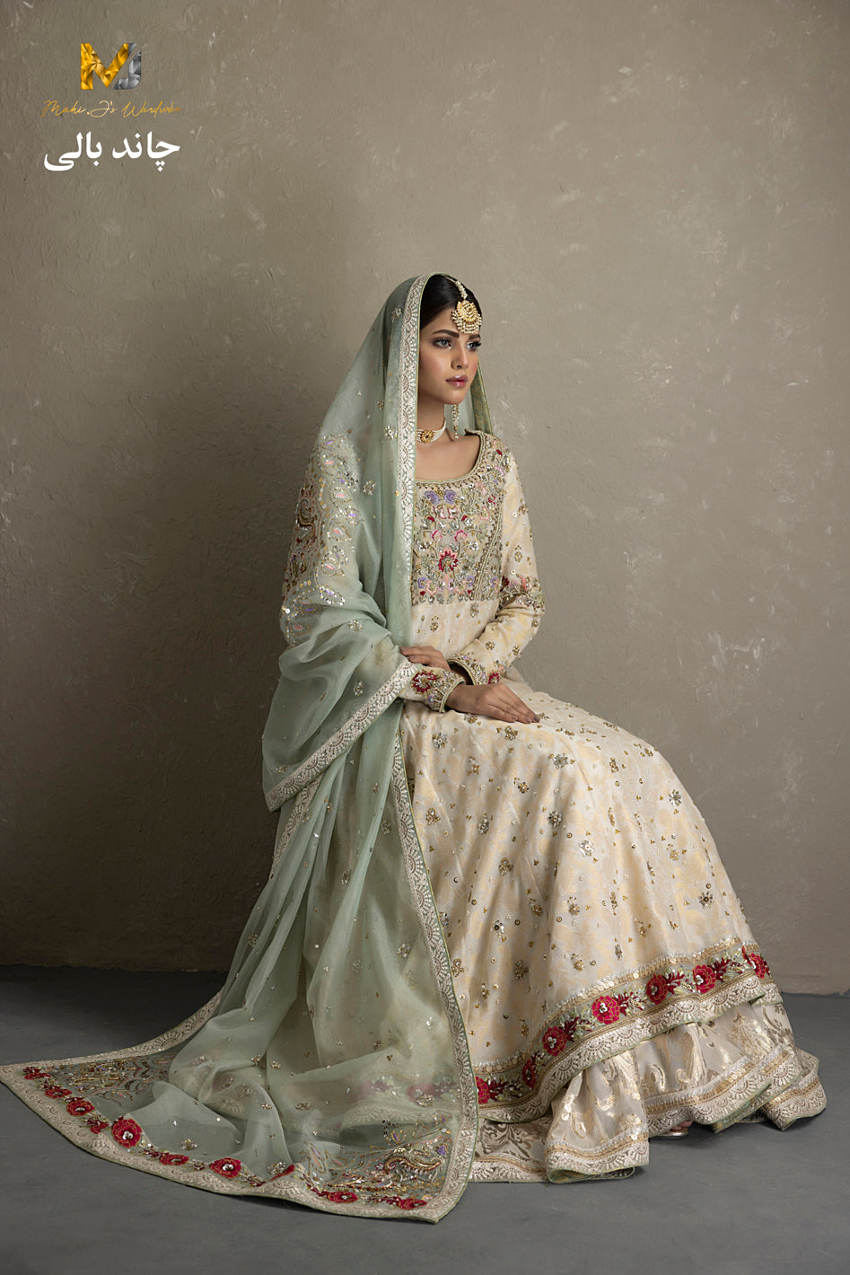 MAH JABEE is our exquisite signature luxury couture off-white kalidar, adorned with enchanting hand-embellished zardozi, delicate beadwork, and intricate flower embroidery. Paired elegantly with a pure COTTON LAMEY silk lengha featuring meticulously handcrafted pleated textures. The ensemble is further enhanced by a stunning hand-embellished dupatta in pure organza silk, completing the ensemble with unparalleled grace and sophistication.