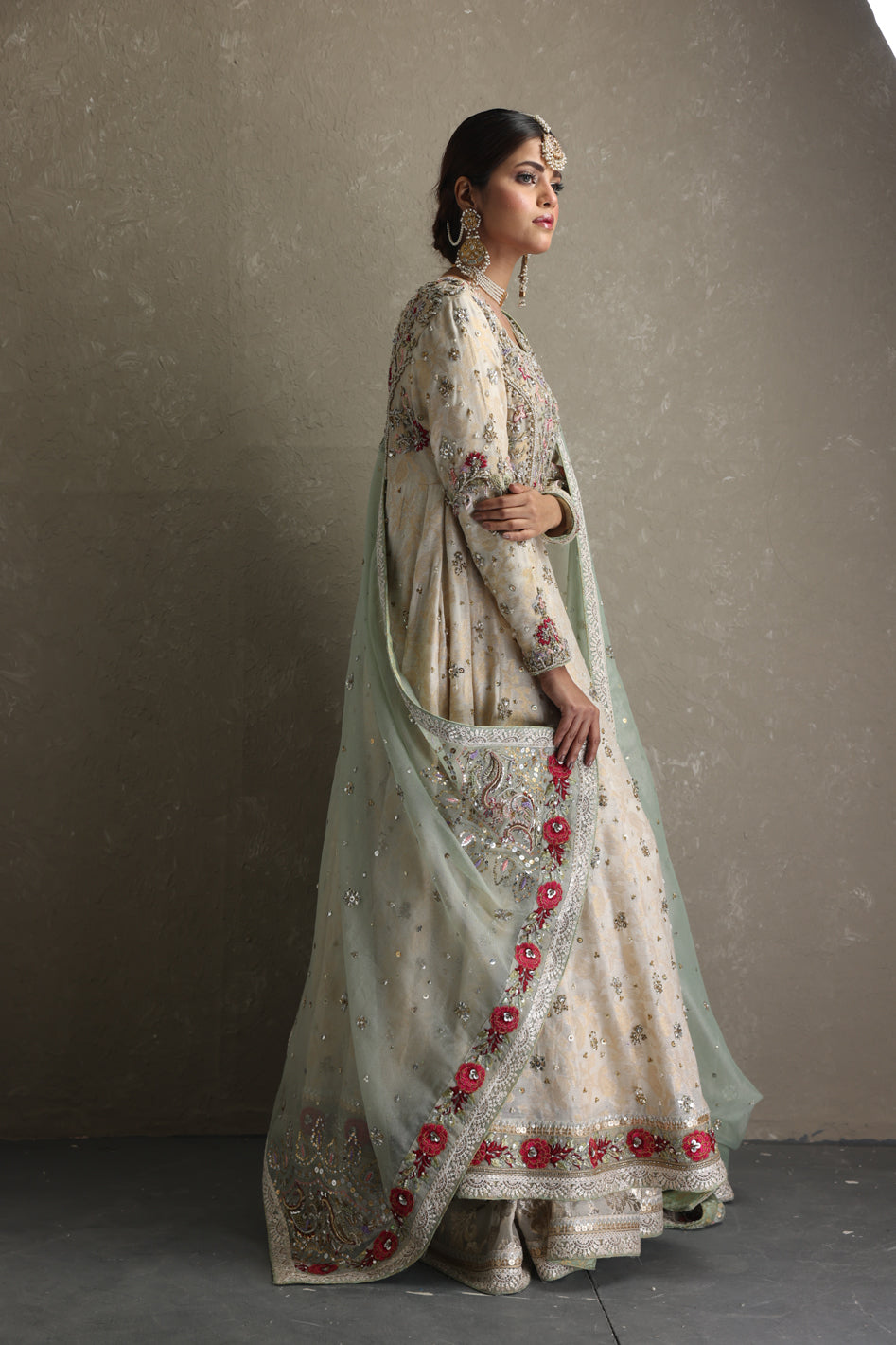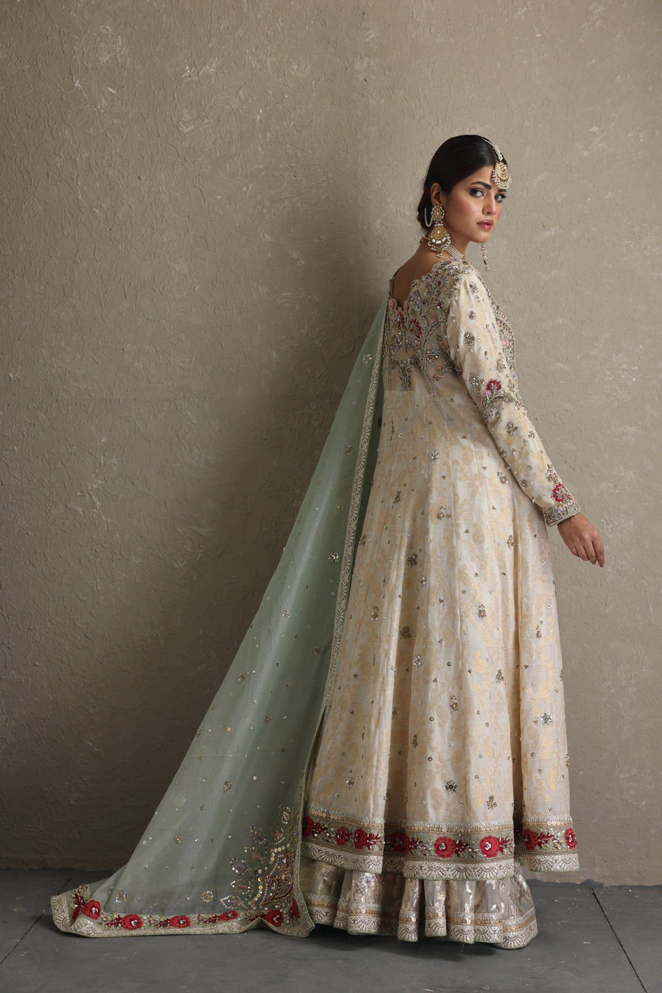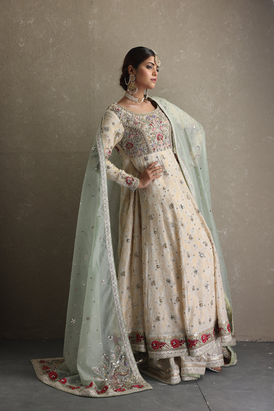 MAH JABEE is our exquisite signature luxury couture off-white kalidar, adorned with enchanting hand-embellished zardozi, delicate beadwork, and intricate flower embroidery. Paired elegantly with a pure COTTON LAMEY silk lengha featuring meticulously handcrafted pleated textures. The ensemble is further enhanced by a stunning hand-embellished dupatta in pure organza silk, completing the ensemble with unparalleled grace and sophistication.