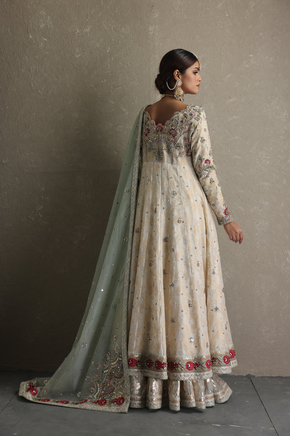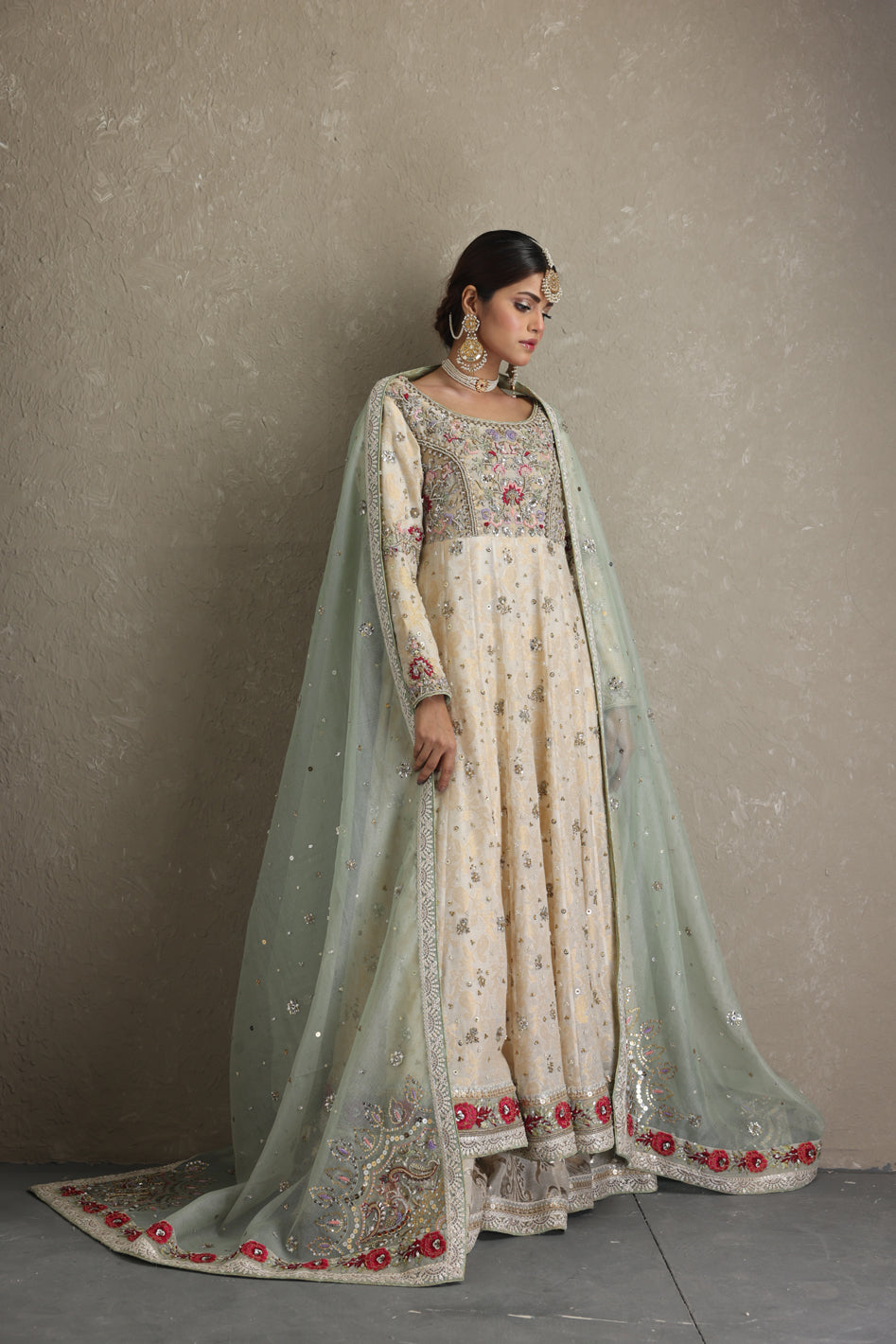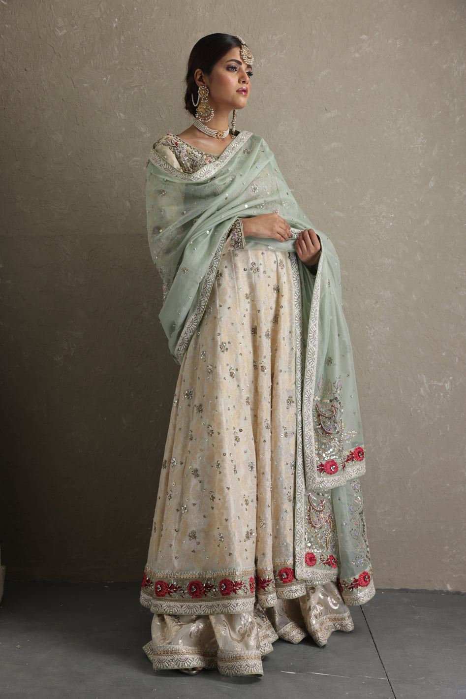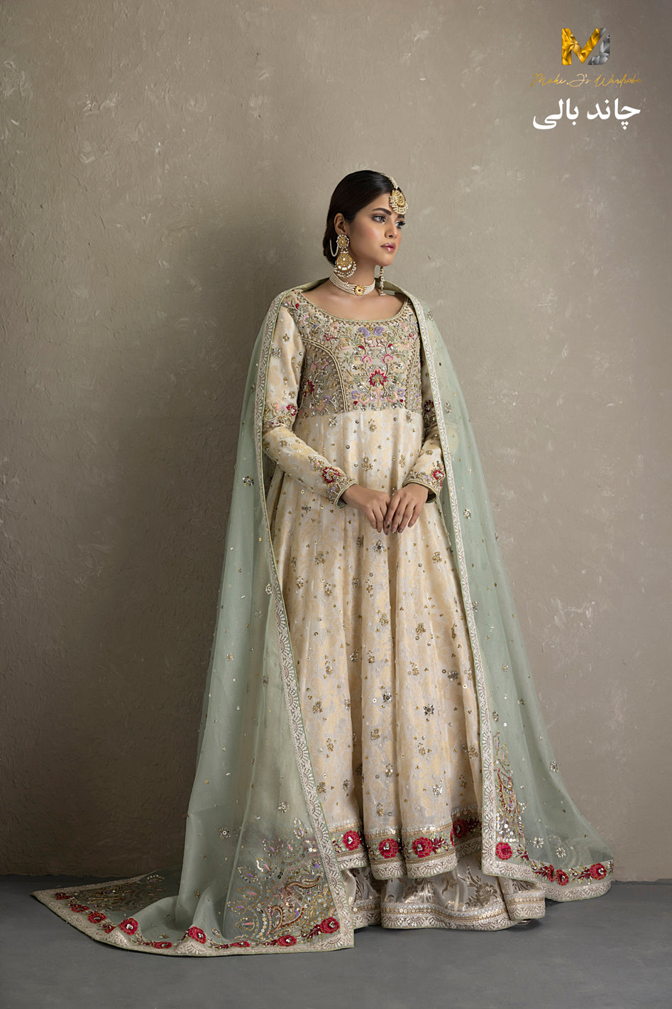 MAH JABEE is our exquisite signature luxury couture off-white kalidar, adorned with enchanting hand-embellished zardozi, delicate beadwork, and intricate flower embroidery. Paired elegantly with a pure COTTON LAMEY silk lengha featuring meticulously handcrafted pleated textures. The ensemble is further enhanced by a stunning hand-embellished dupatta in pure organza silk, completing the ensemble with unparalleled grace and sophistication.