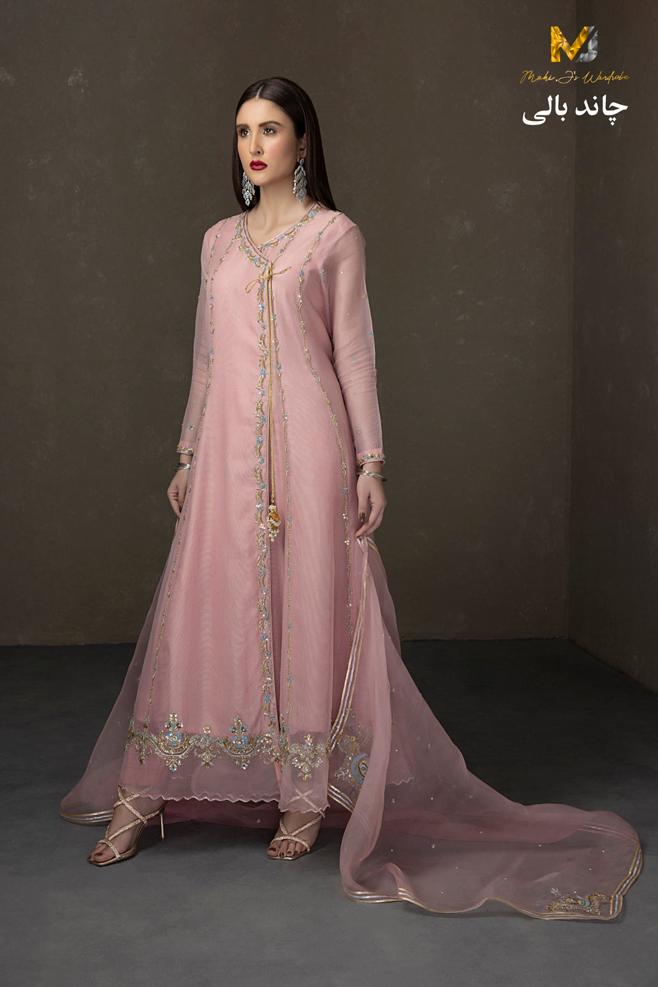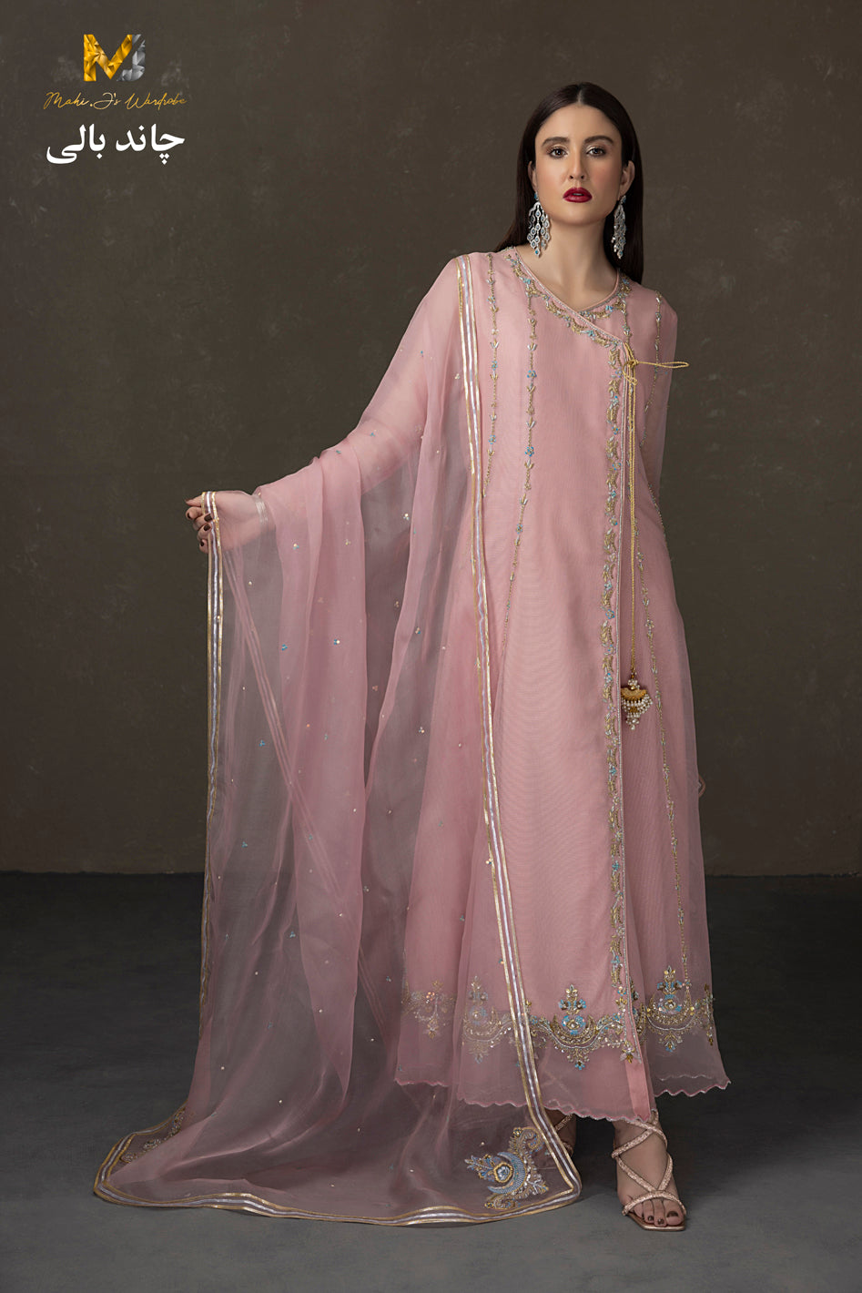 This fresh A-line deep periwinkle shirt paired with a delicate organza dupatta in the same hue is the perfect show-stopping outfit to take you to any event or late-night festivities. The shirt, cut from pure raw silk has been adorned with exquisite pastel silk threadwork and hand embellishments. To keep a slight contrast with the the elegant organza dupatta is a slightly lighter hue than the shirt, trimmed with a delicate pink and lavender embroidered border.