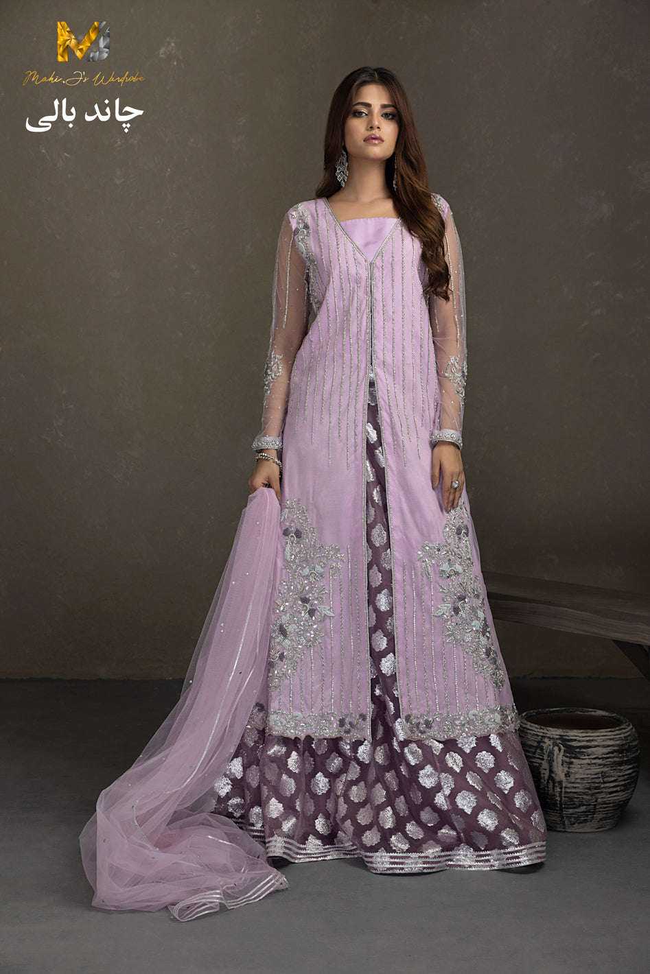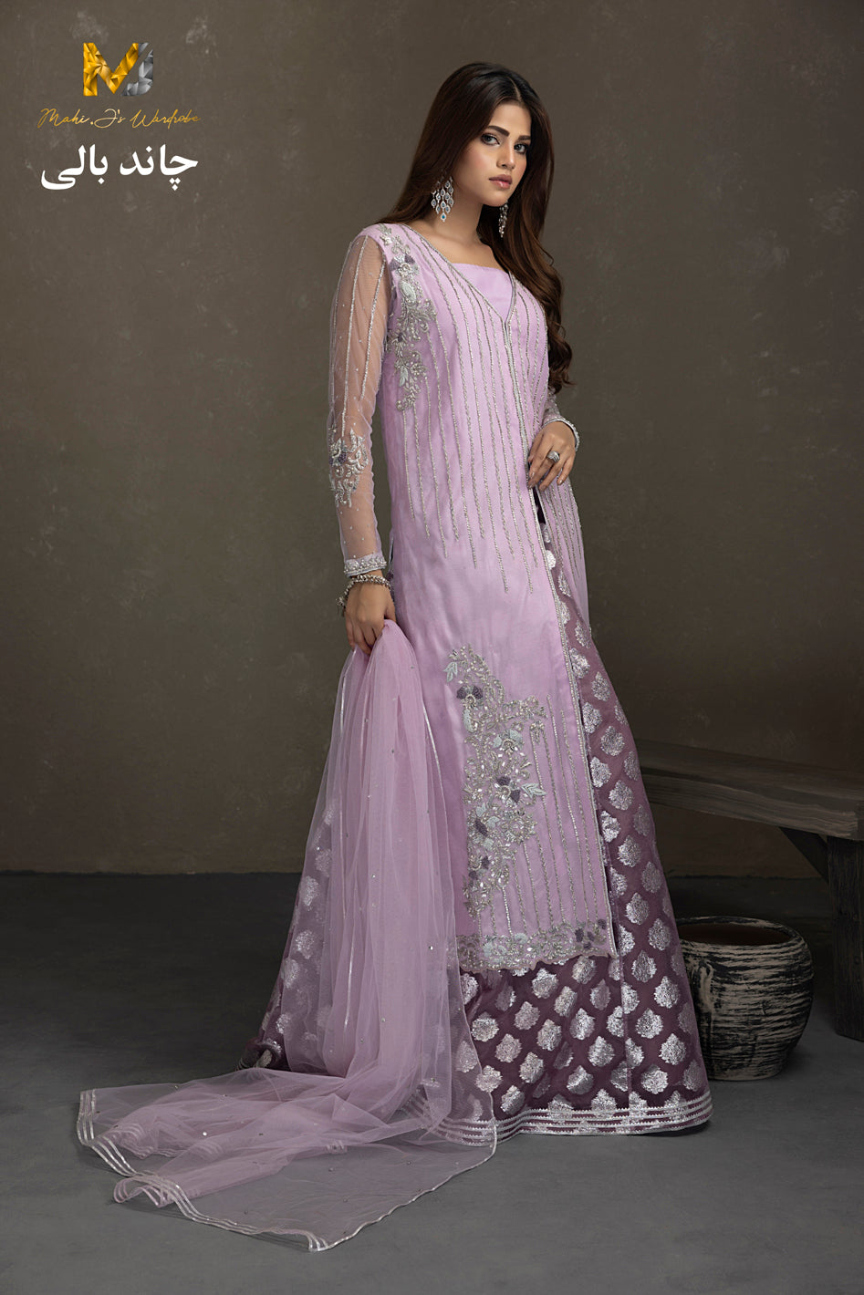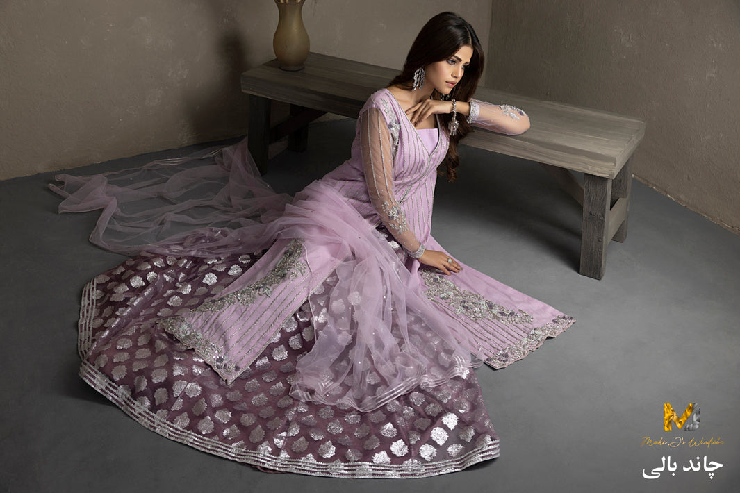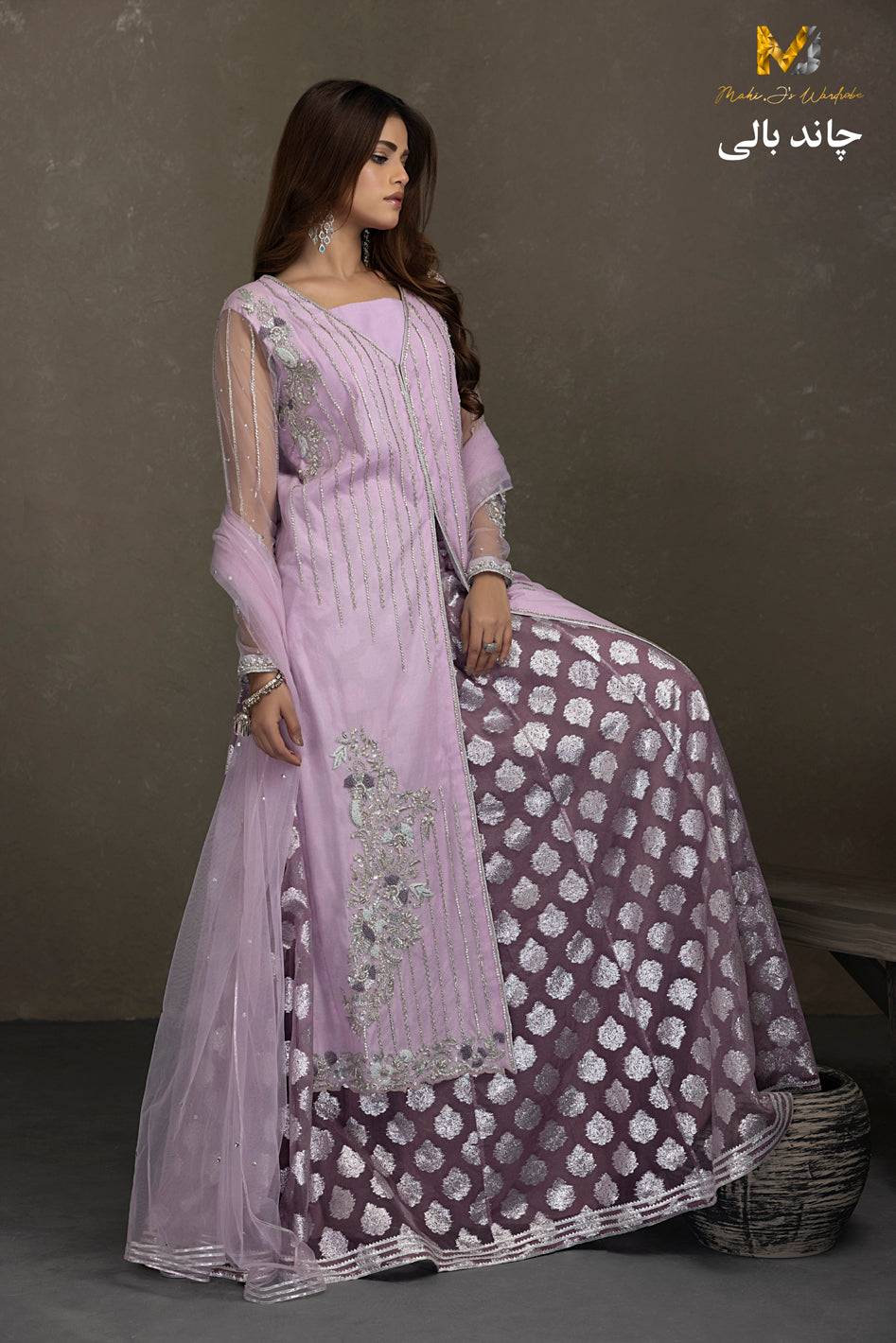 Elevate your wardrobe with our meticulously crafted hand-embroidered silk long ajkan, featuring fine silk aari embroidery. The jacket, adorned in a delicate lilac hue, showcases imagery inspired by muglaies tapestries, adding a touch of elegance. Delicately embroidered with soft colors, this statement piece transcends time, promising enduring style. Fully handcrafted and exquisite in detail, it seamlessly pairs with our tissue laurex lengha or adds flair to your look when combined with flared pants
