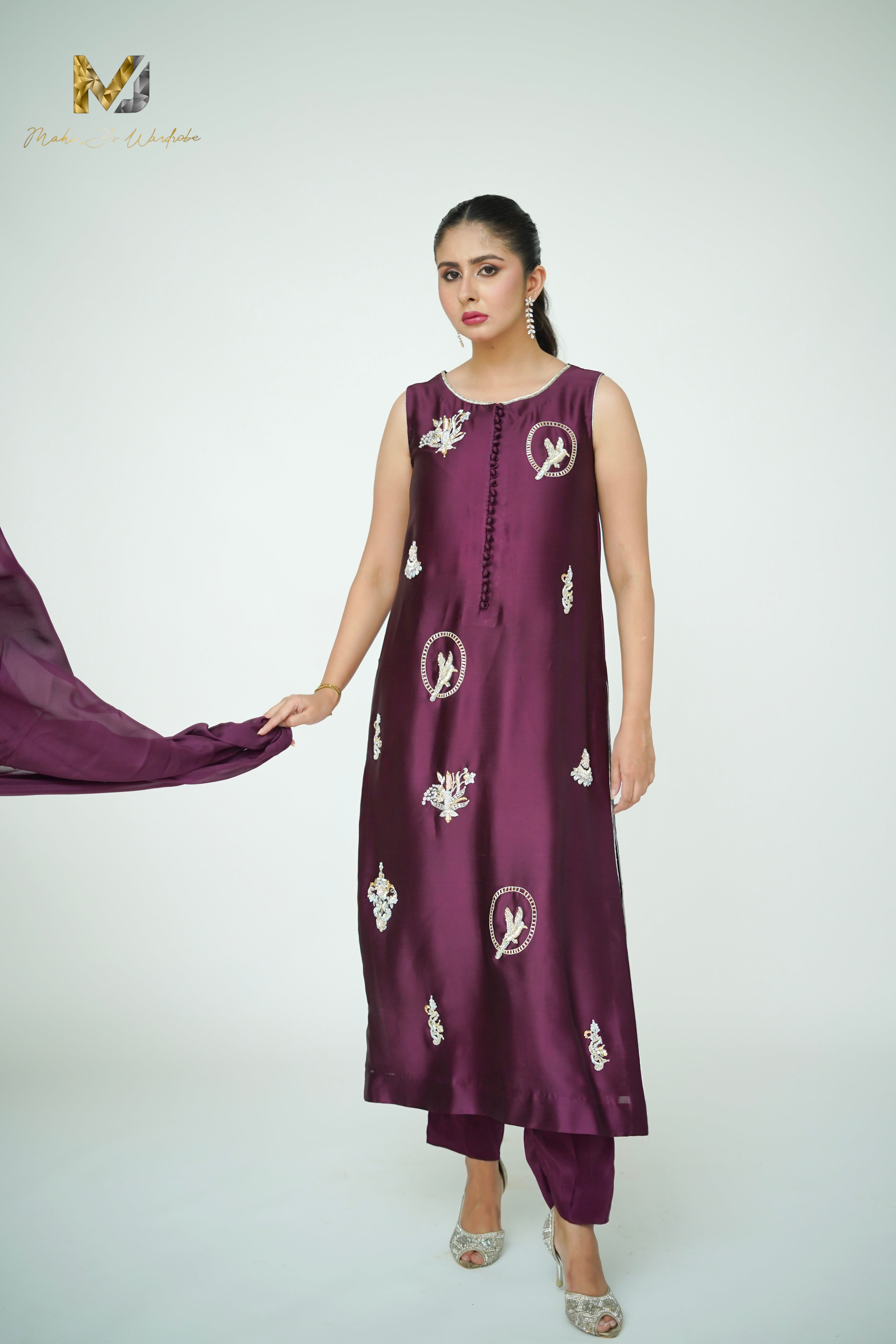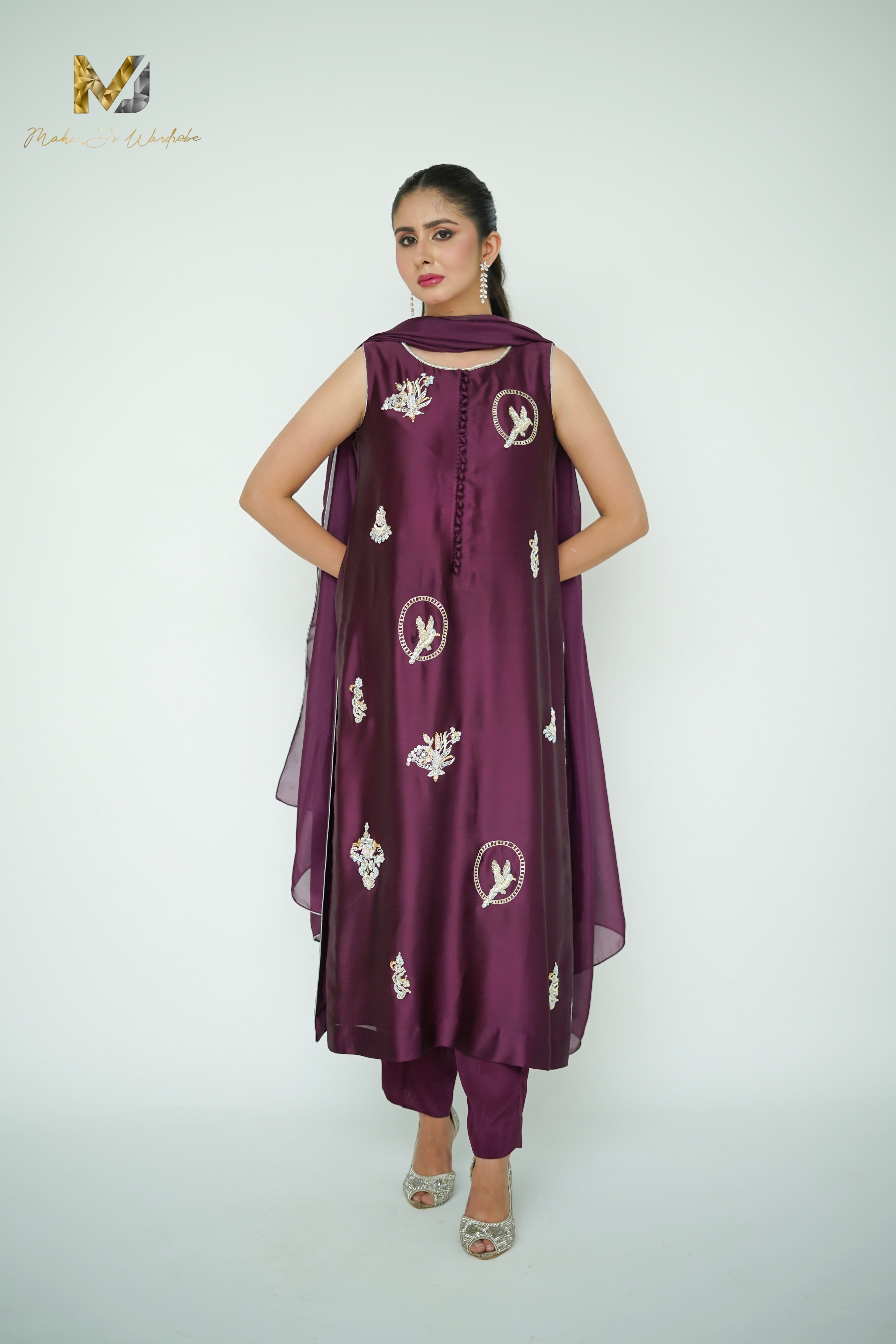 The most flattering straight cut boasting our favourite colour, an enticing plum purple ! Chanelling old school feminine charm with the finest craftmanship using traditional motives with zardozi, the ensemble is a heirloom piece to be passed on through generations! A silver & gold signature design ,,,,silk dupatta with signature MJ stitching details brings the outfit together with grace!