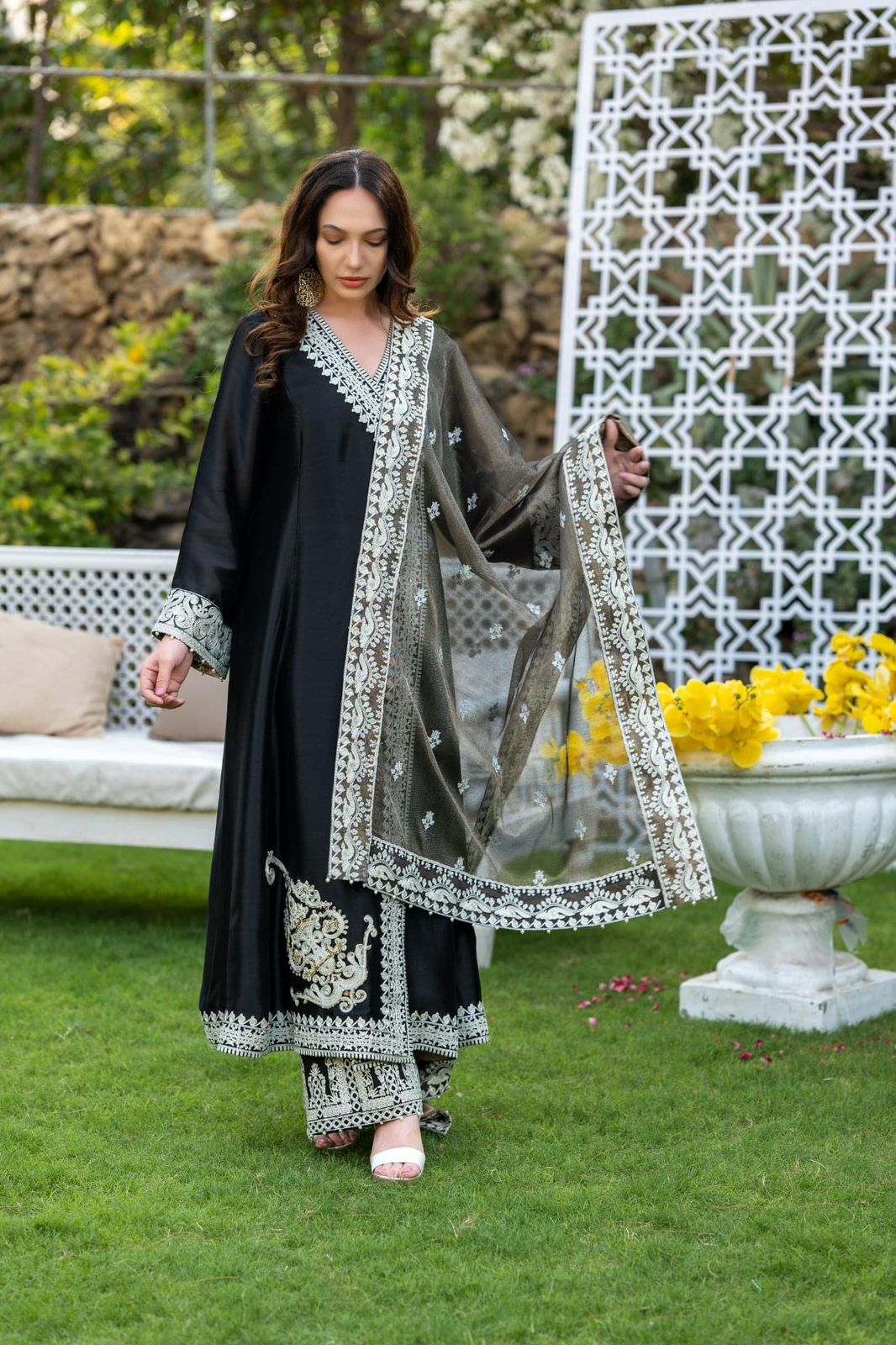 Experience timeless elegance with ‘Zoha ’. A traditional yet modern pure silk prince panel Angarkha with embroidery shirt in a stunning shade of black and white