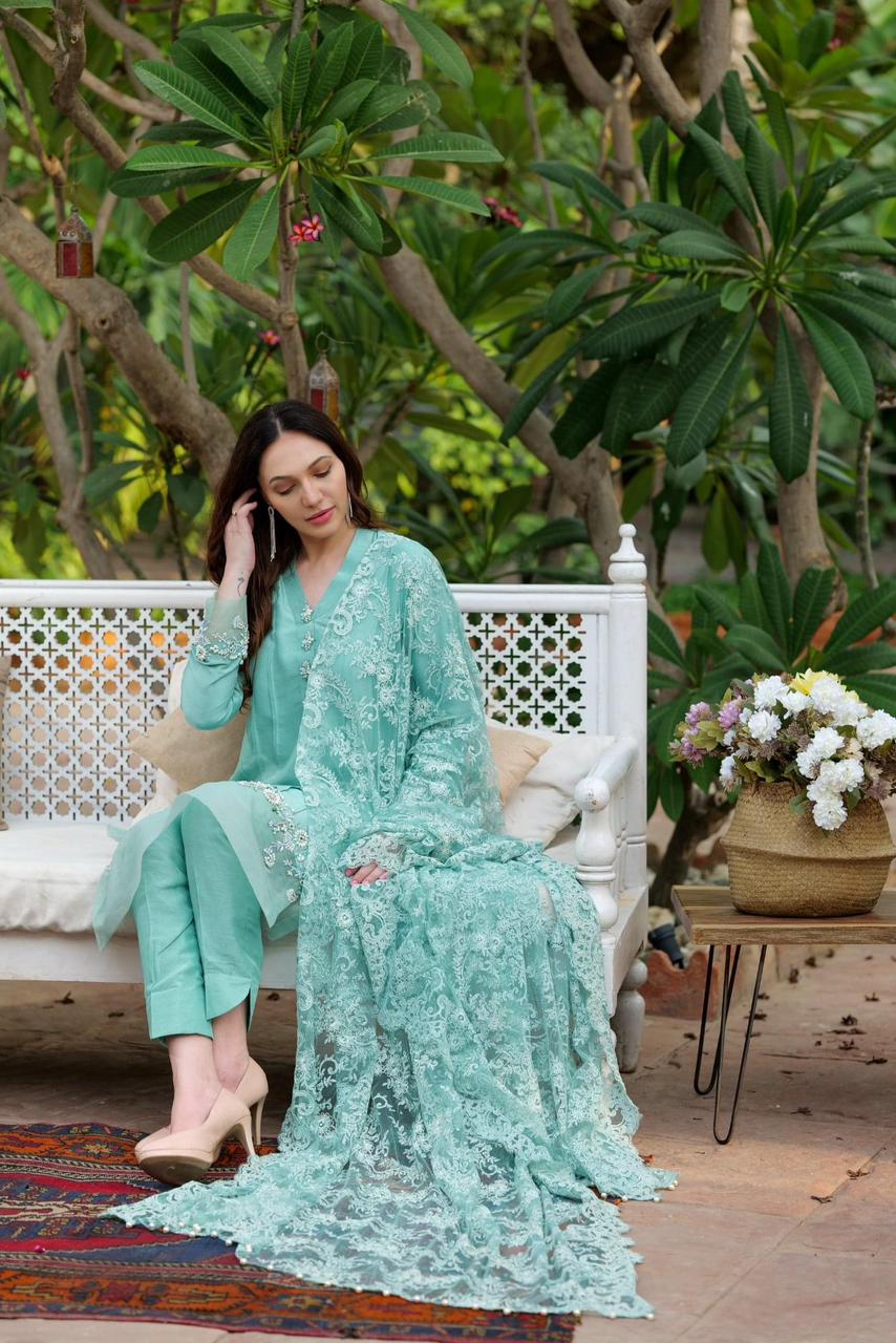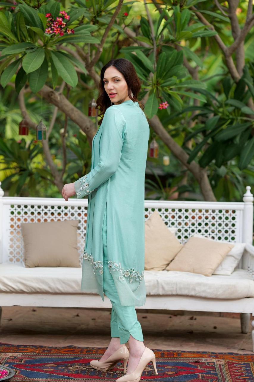 Brimming with structured finesse, the cool green showcases the fluidity of the silk long shirt front pleated with attached organza, intricately worked with pearls. Zardozi added a delicate, cool green tone. The silk piece is brought to life via an artistically arranged embroidery pattern, paired with straight pants and organza/ silk Dupatta.